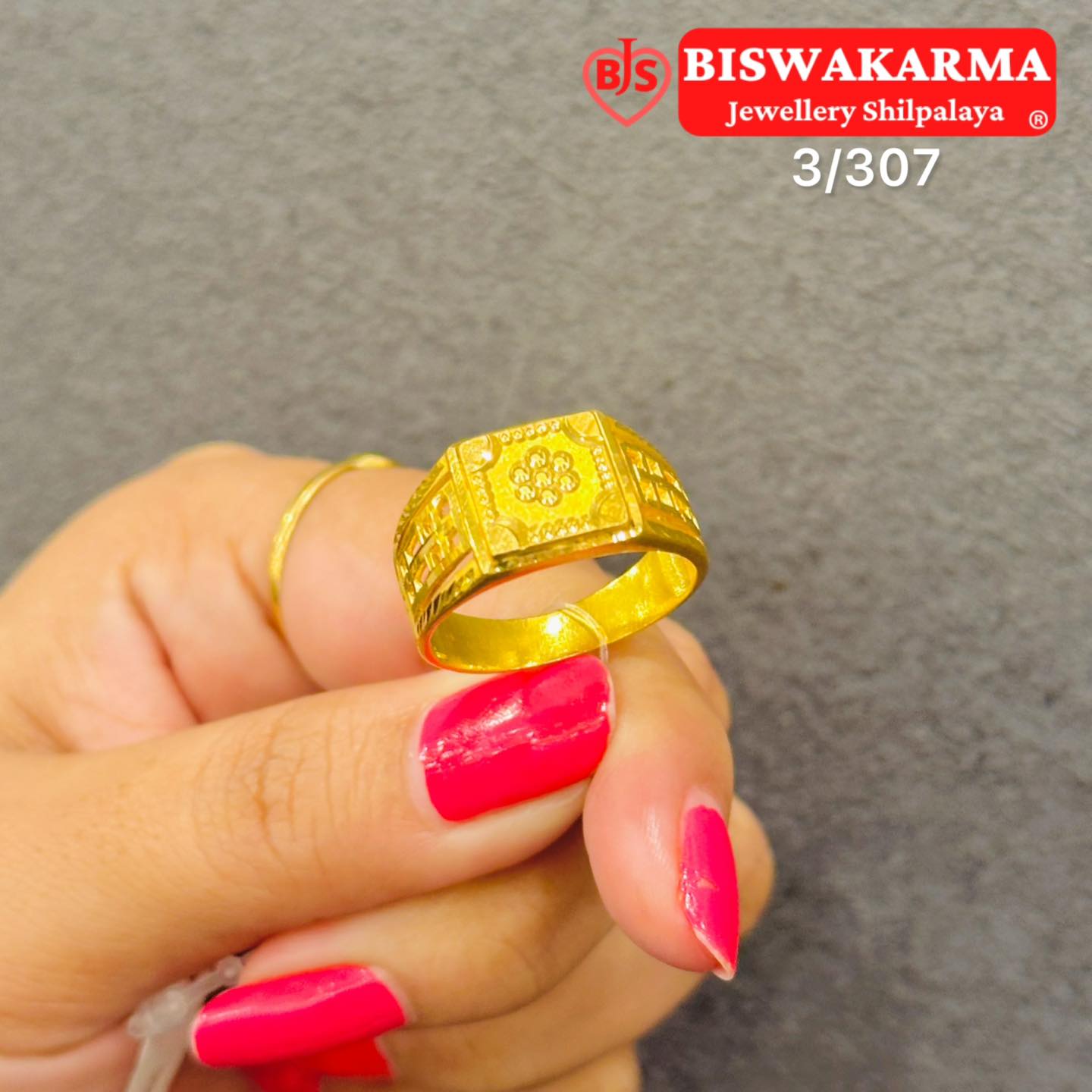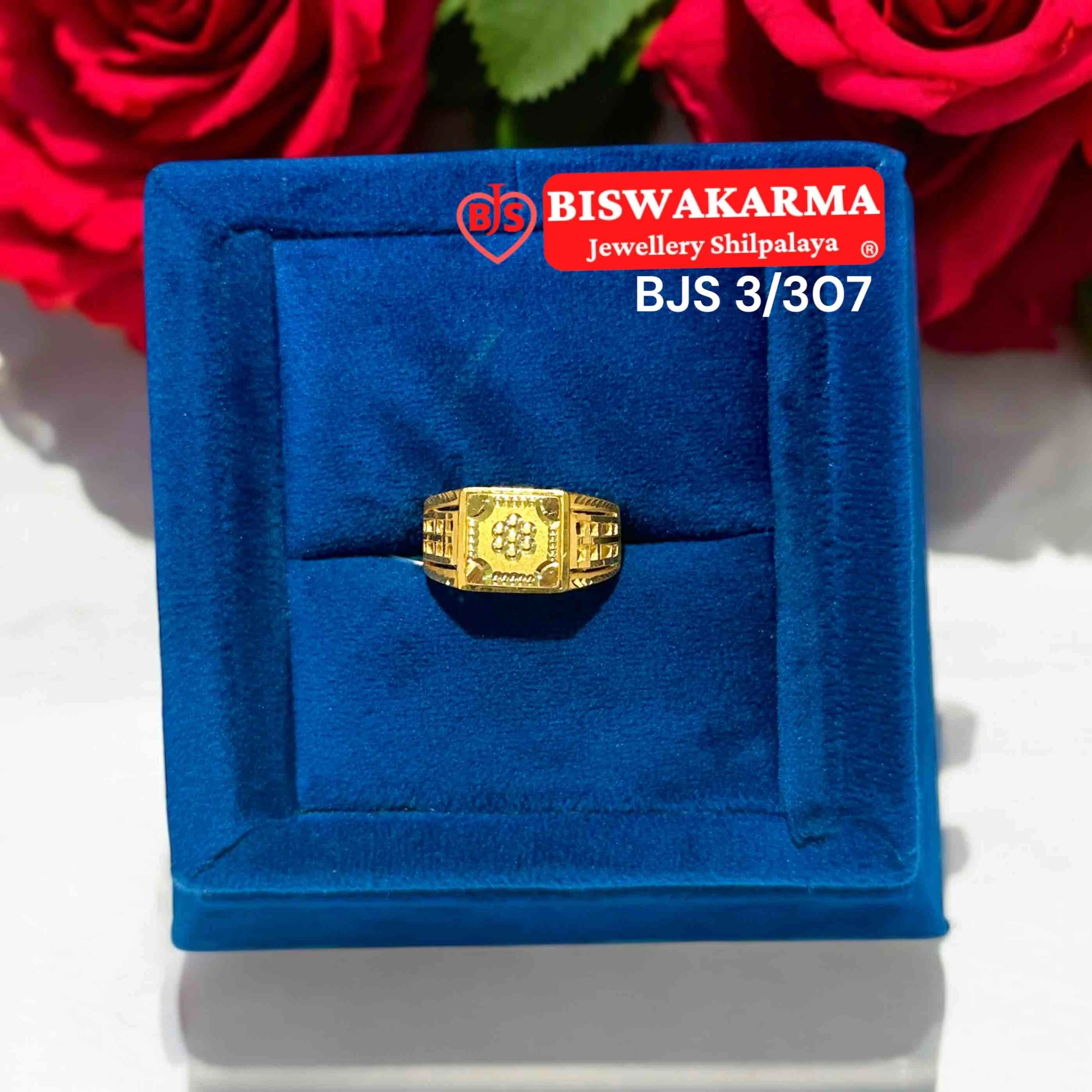 A distinguished gold ring with a floral center and ornate side engravings, blending traditional artistry with bold masculine design.
