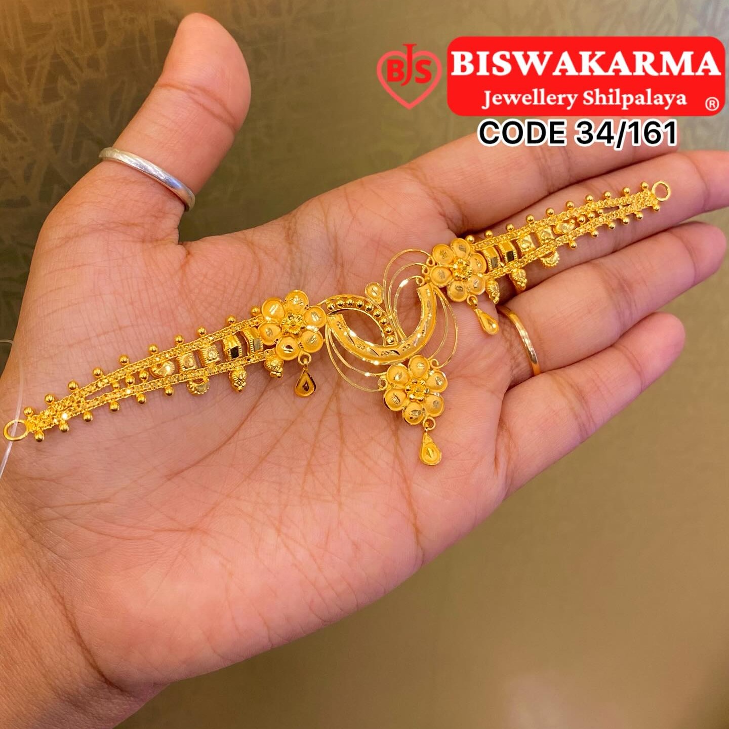 Two smooth loops meet at the center, shaped with tiny dotted cuts and soft curved lines. Gentle hanging drops add a warm golden sway that makes the design feel sweet and charming.