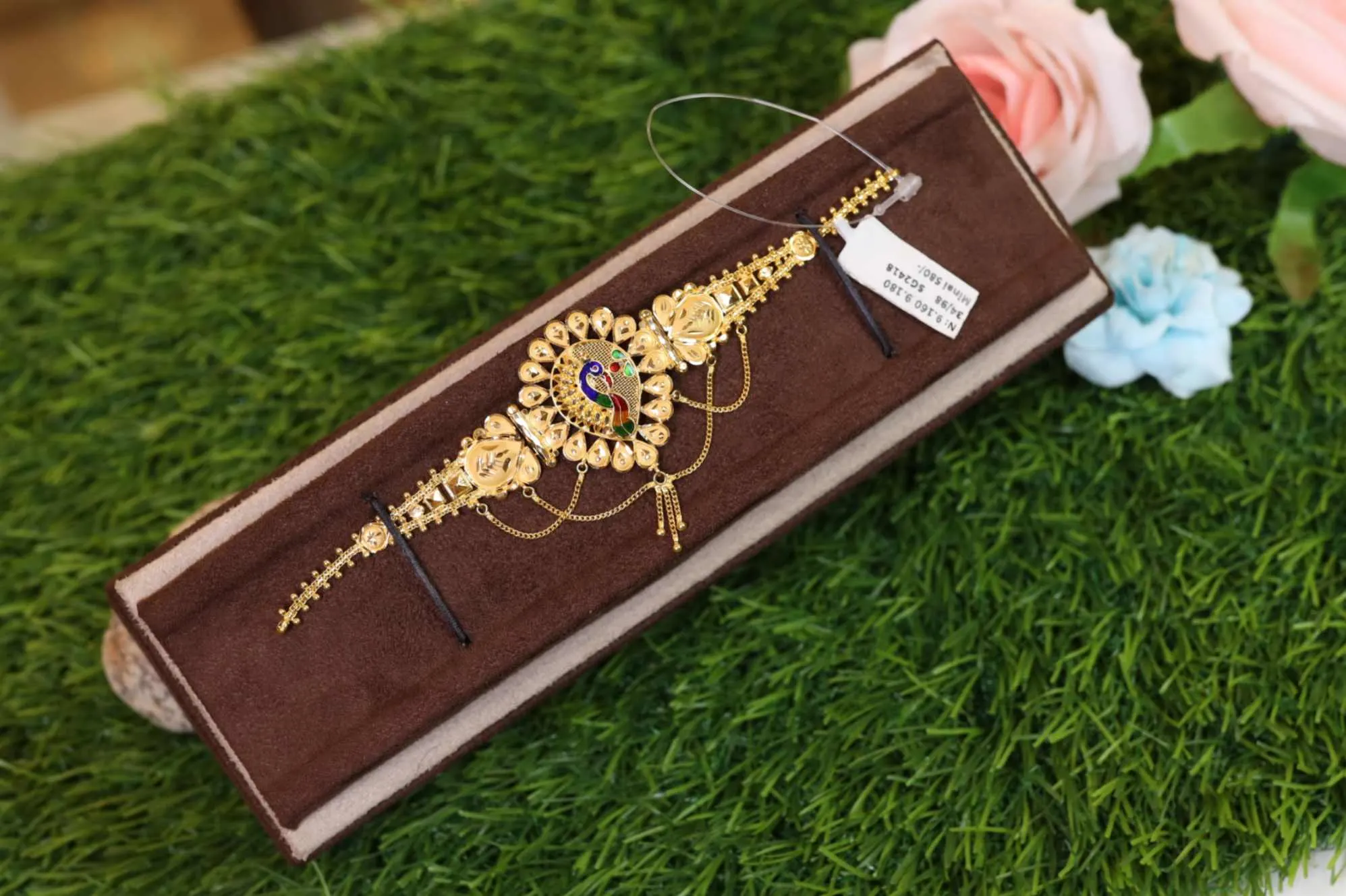 A tiny peacock motif sits inside a ring of soft petal shapes, each carved with neat lines. Curved chains and slim drops add a gentle sway that makes the design feel warm and charming.