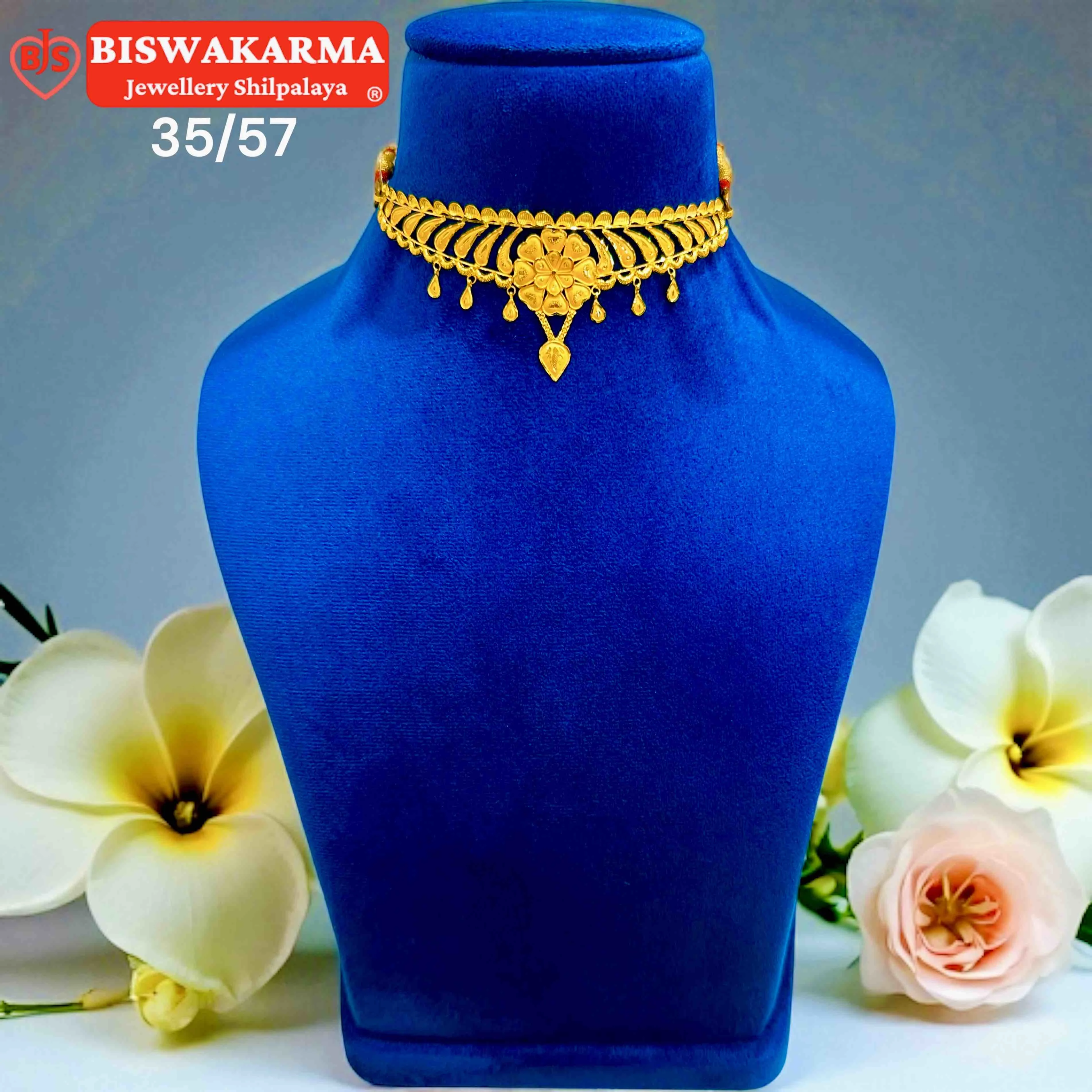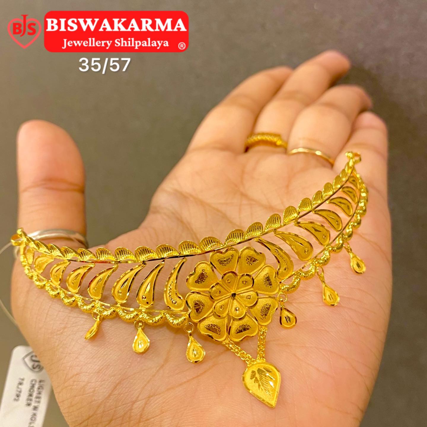 Soft curved bands open into a clean floral kolshi center, with tiny drops gently hanging below. The smooth shine and neat cuts give it a warm, charming glow.