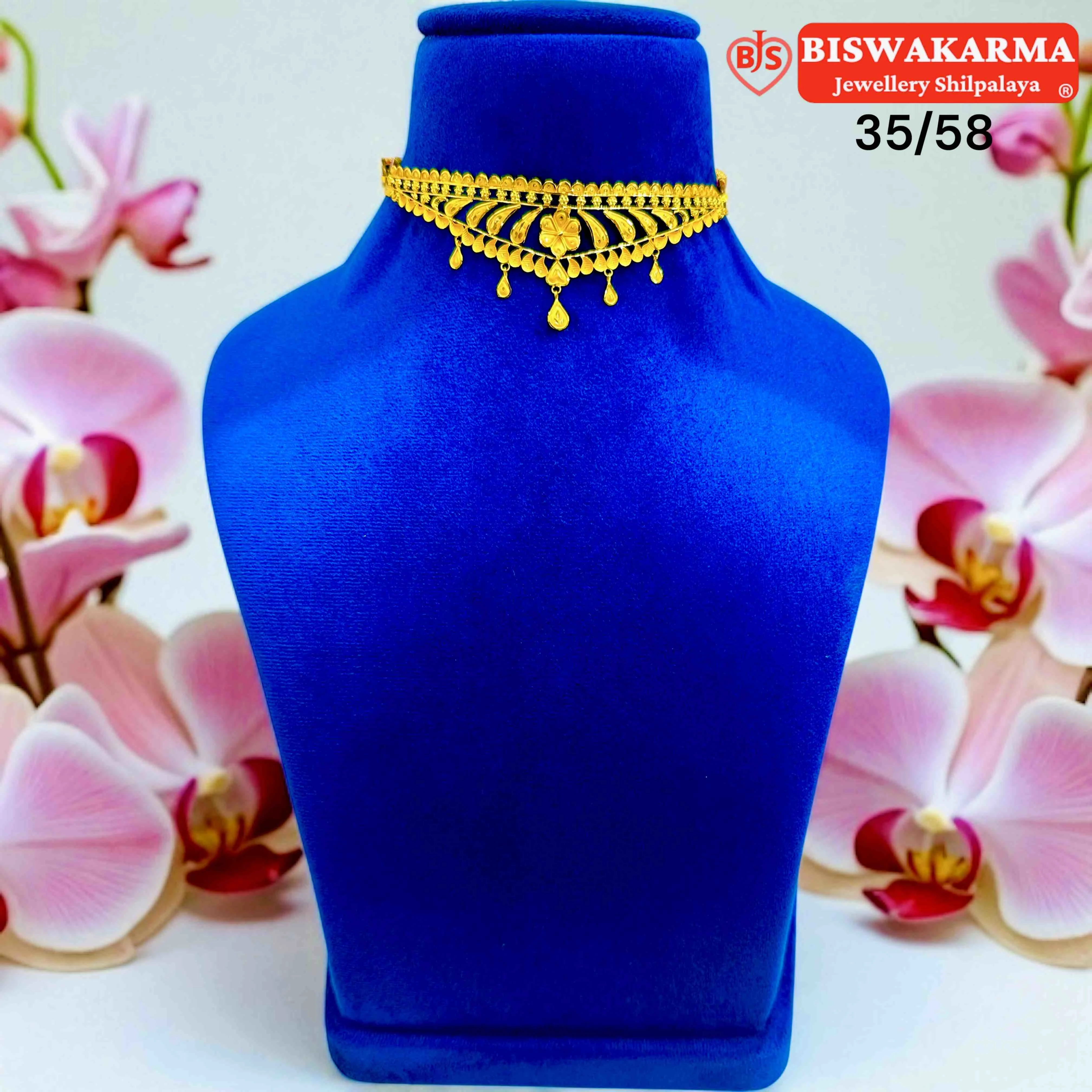 Arc-shaped layers sweep into a tidy kolshi center, with tiny drops gently hanging below. The smooth shine and neat detailing give it a soft, glowing charm.