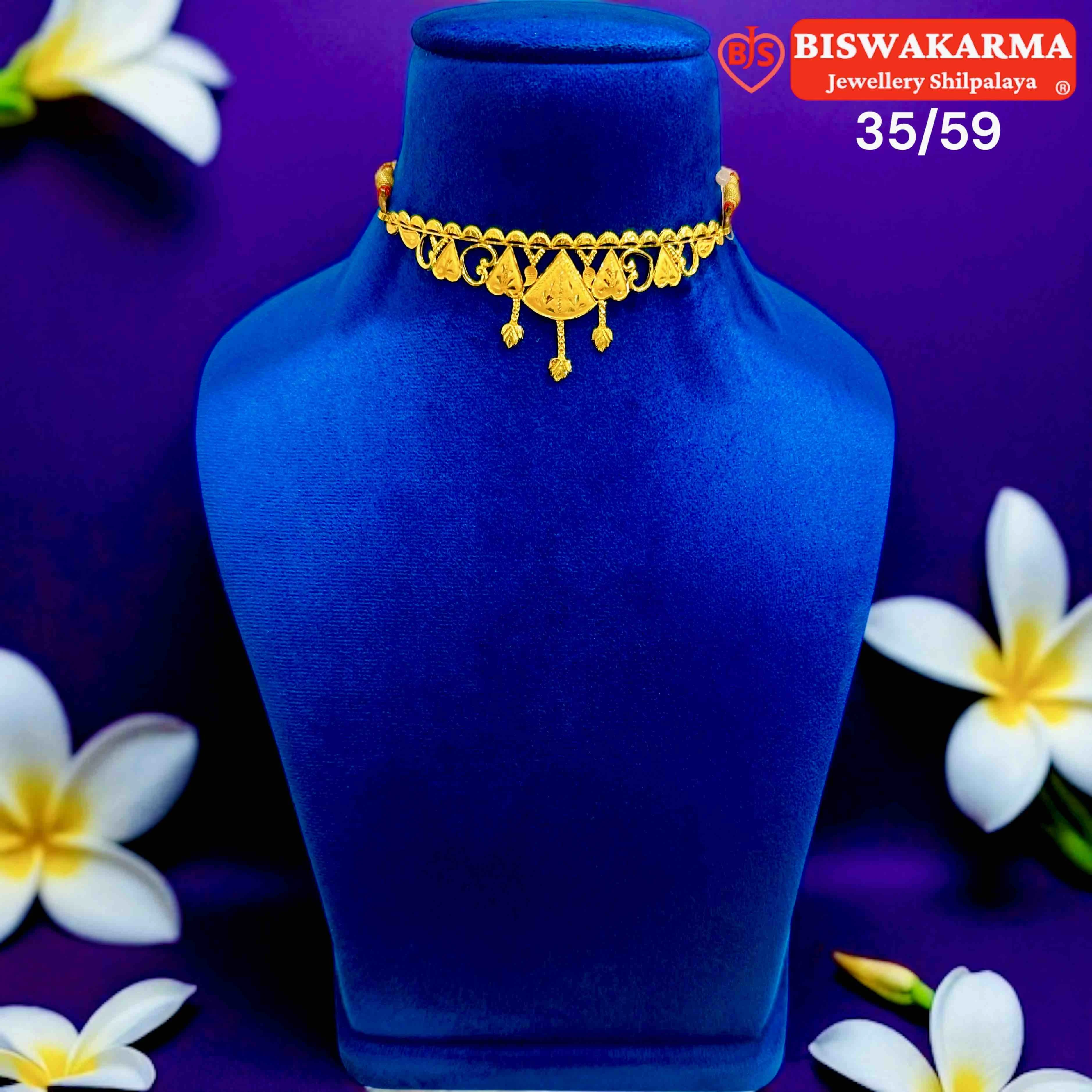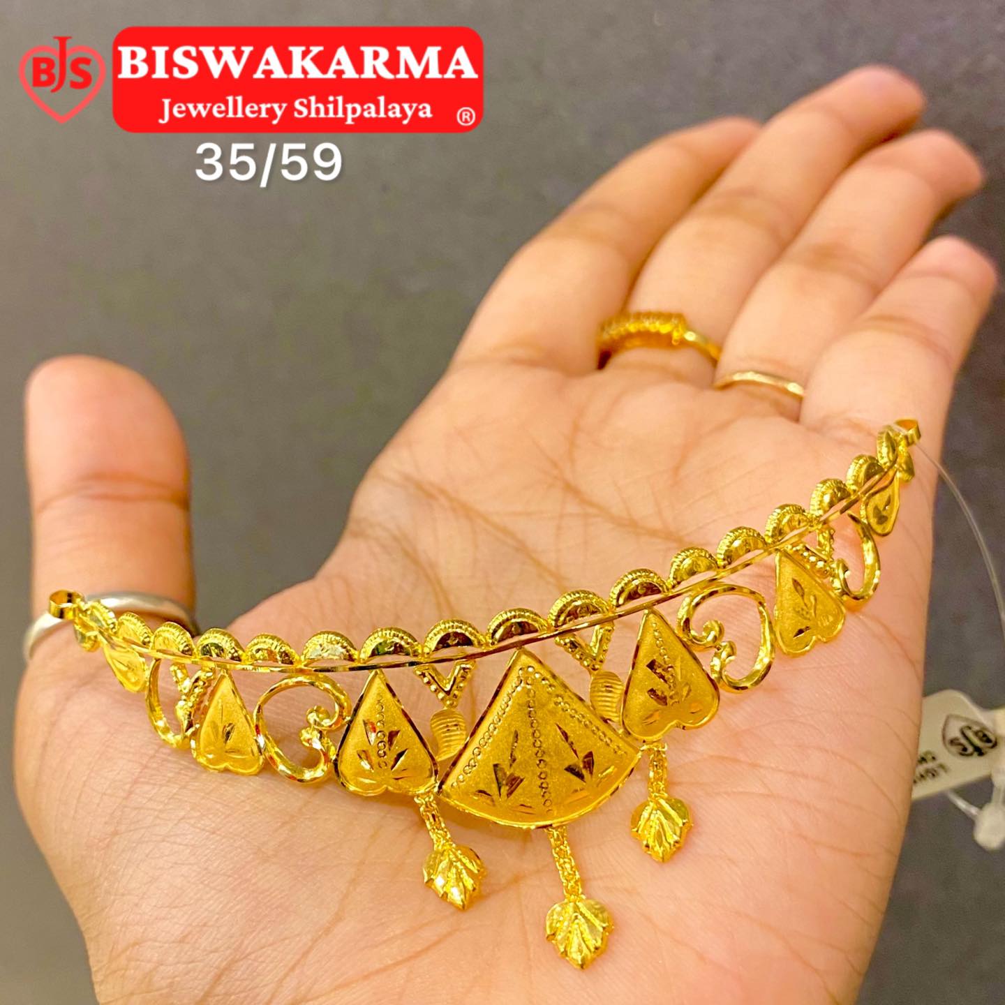 Slim leaf curves meet a neat kolshi center, finished with tiny soft-hanging drops. The clean lines and warm shine make the design feel gentle and charming.