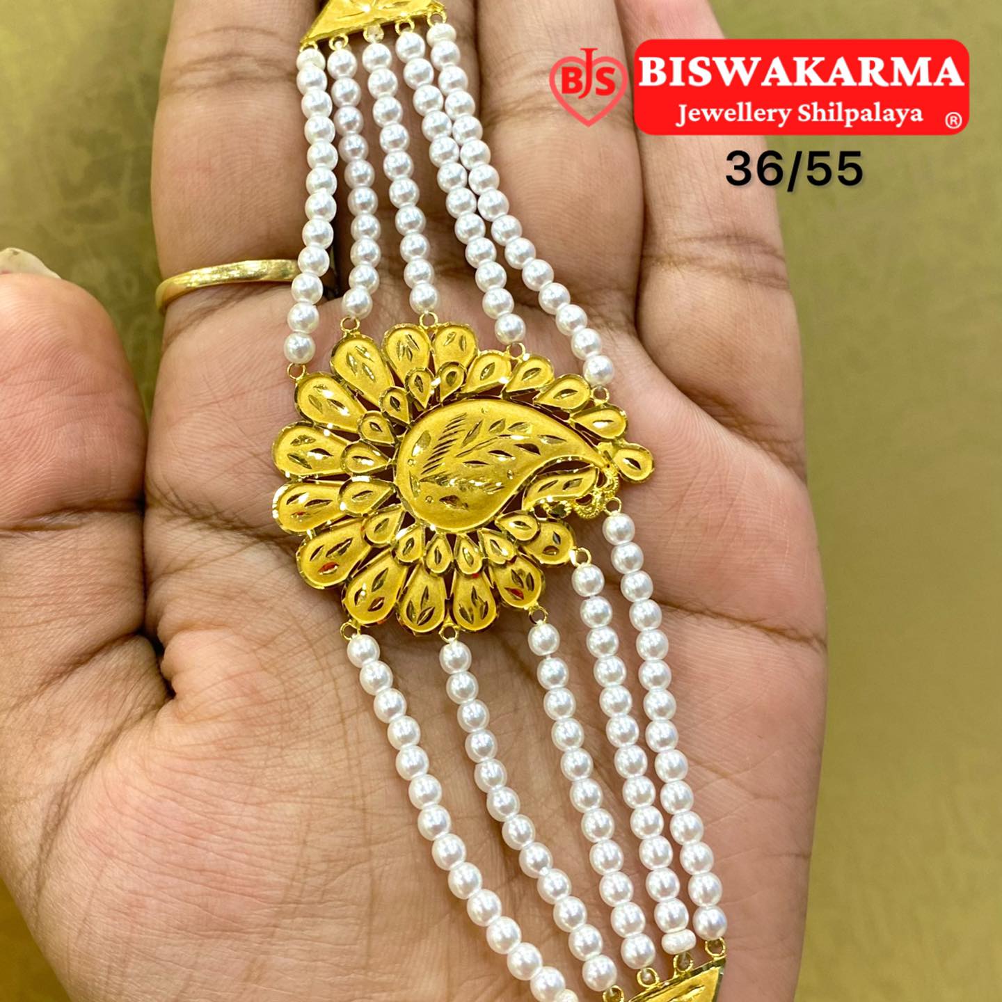 A luxurious pearl-lined mantasha with a radiant floral centerpiece, blending elegance and charm for timeless festive or bridal adornment.
