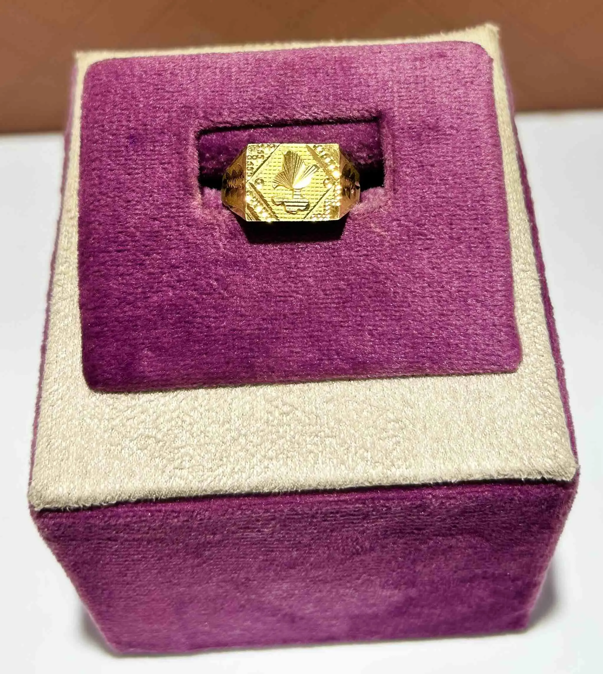 A bold gold ring showcasing a pyramid-inspired center with intricate geometric patterns, symbolizing strength, ambition, and modern elegance.