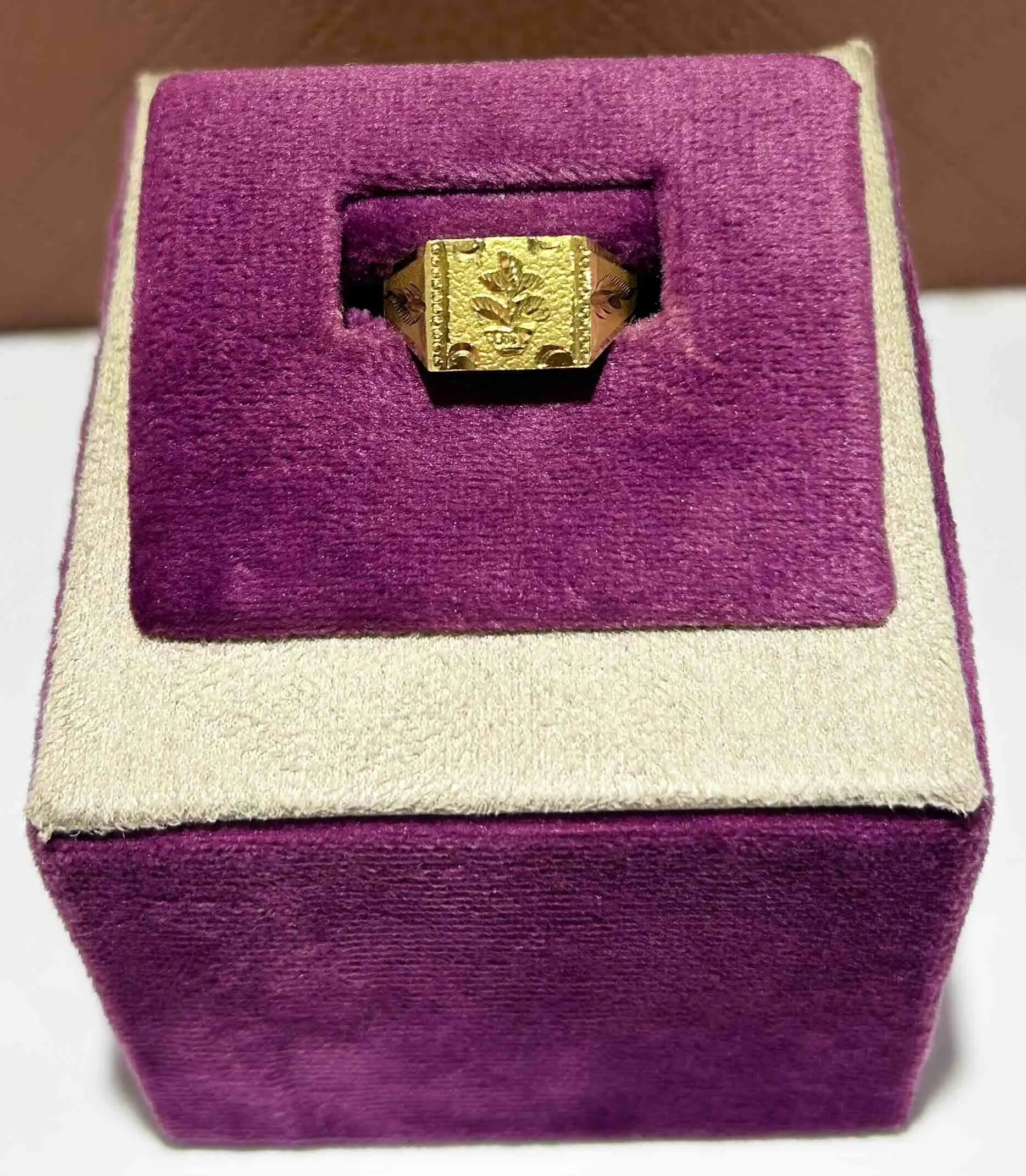 A classic gold ring featuring a delicately engraved floral motif with textured detailing, exuding grace, tradition, and timeless masculinity.