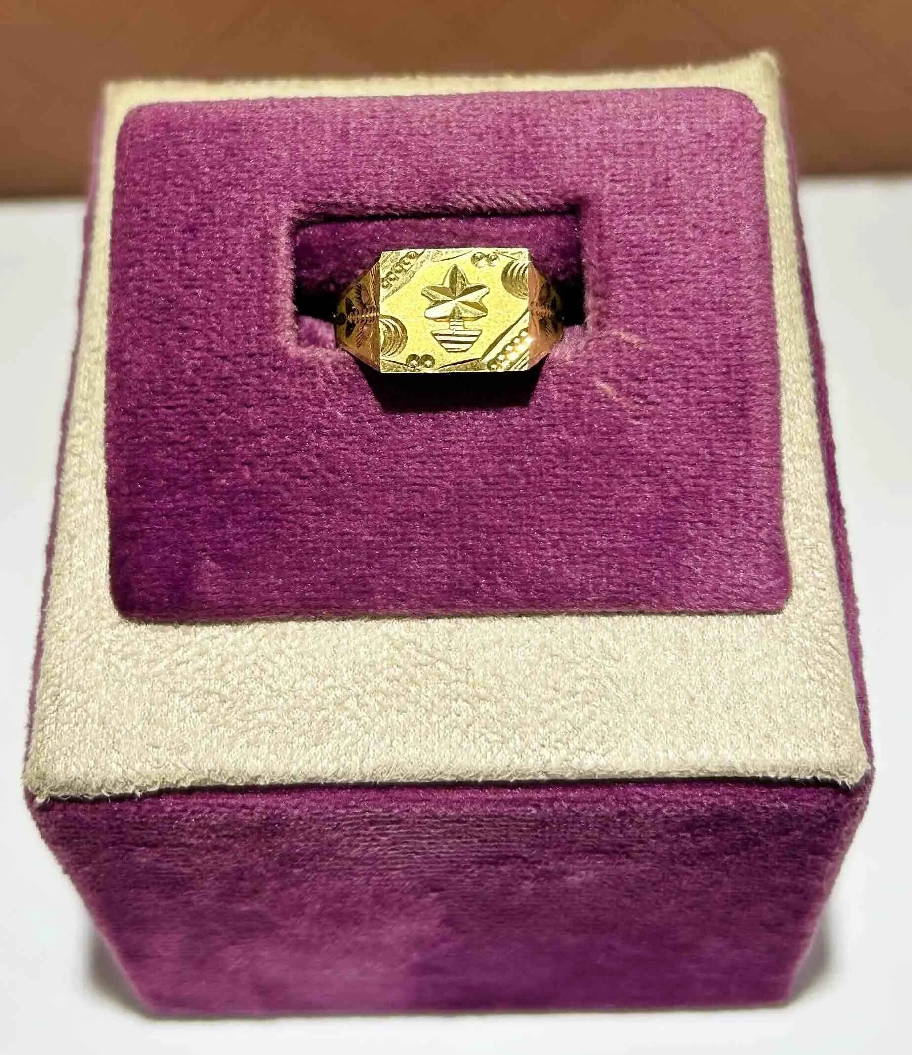 A refined gold ring with a hexagonal face and a bold star engraving, merging modern geometry with traditional craftsmanship for a timeless appeal.