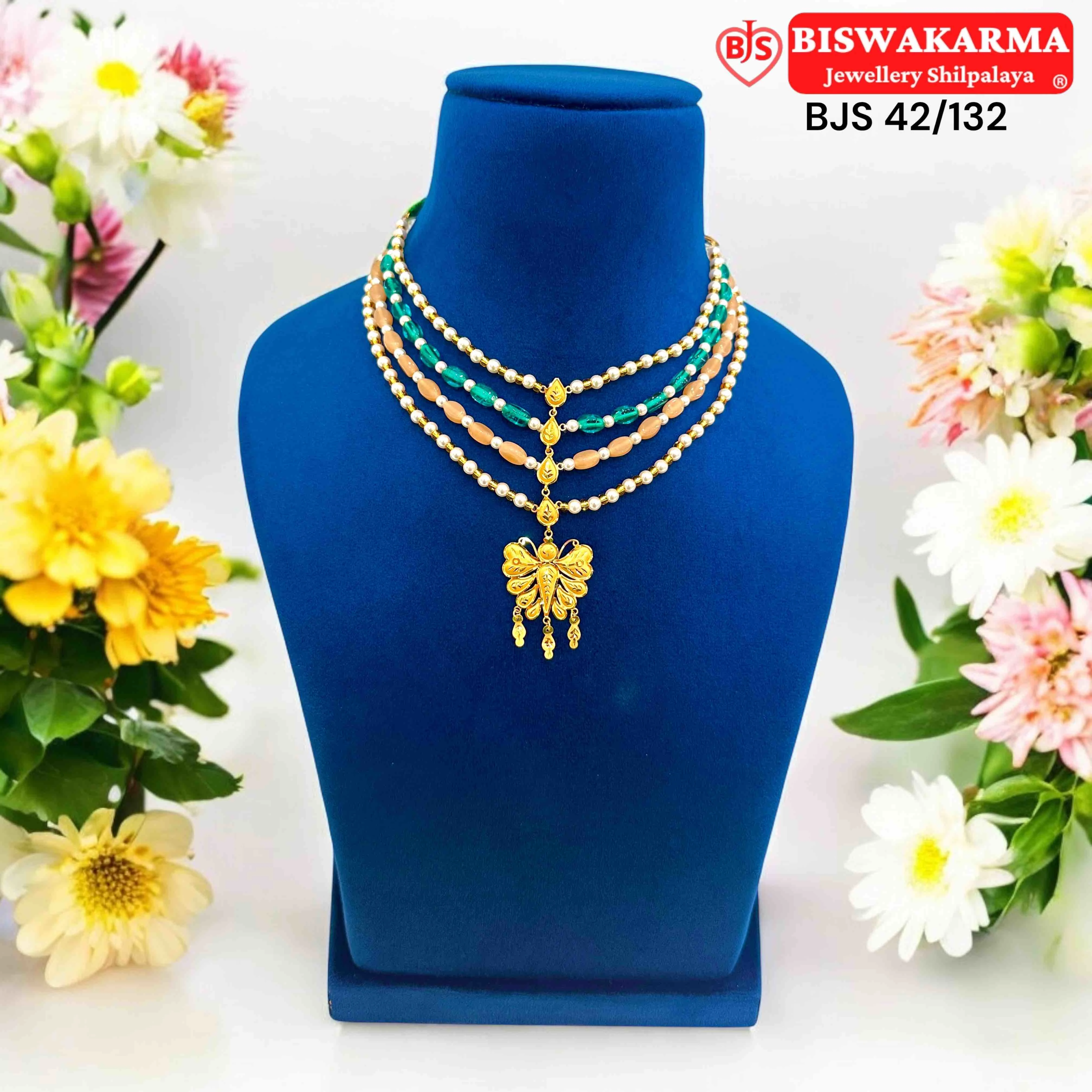 This elegant necklace features soft pearl layers with green accents and a floral gold pendant, bringing out a timeless charm in every graceful look.