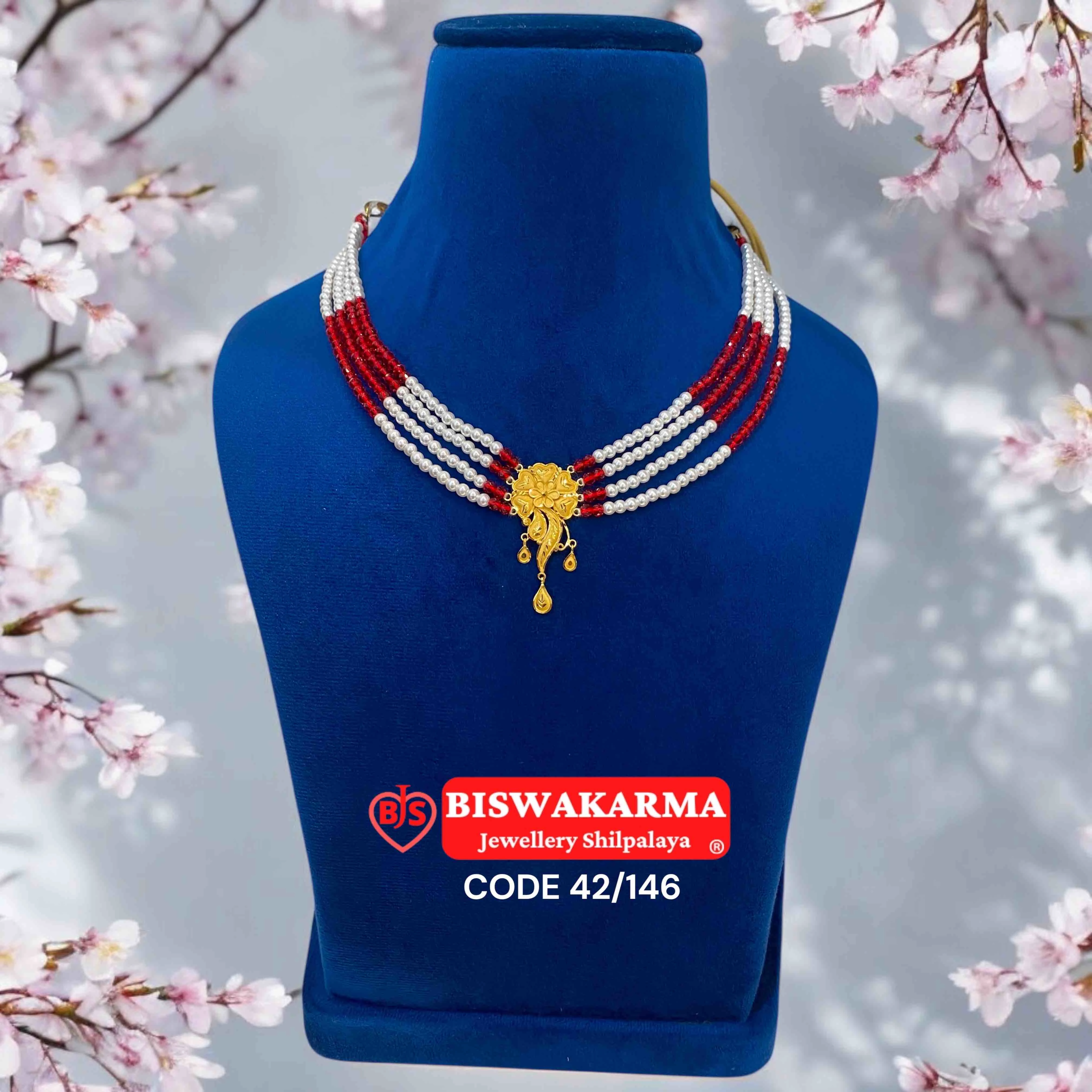 A three-layer ruby and pearl necklace with a floral gold pendant, symbolizing grace, purity, and the timeless elegance of tradition.