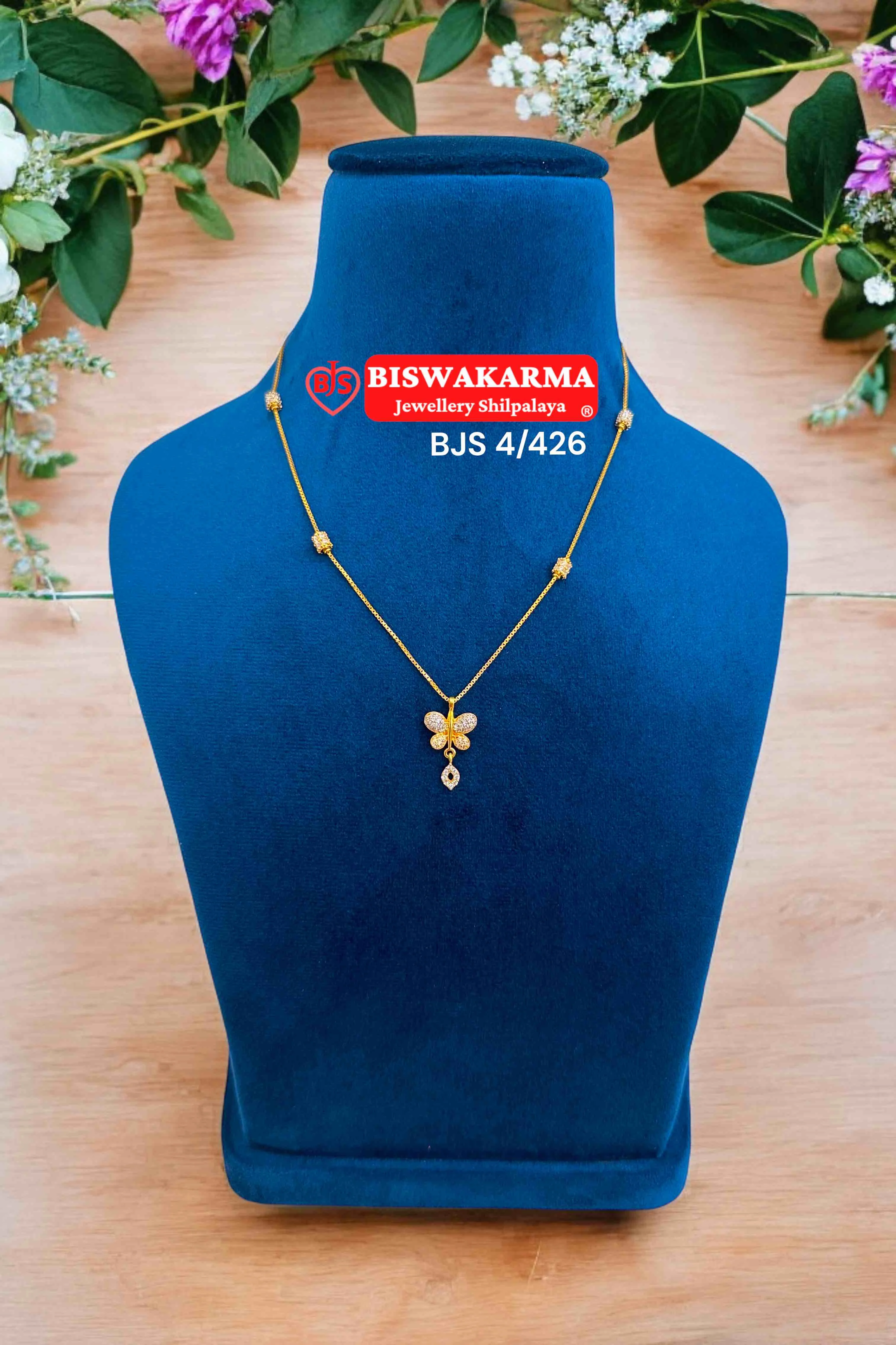 A lovely gold chain with a flower-shaped pendant and delicate hanging drop, adding a graceful bloom to every outfit.
