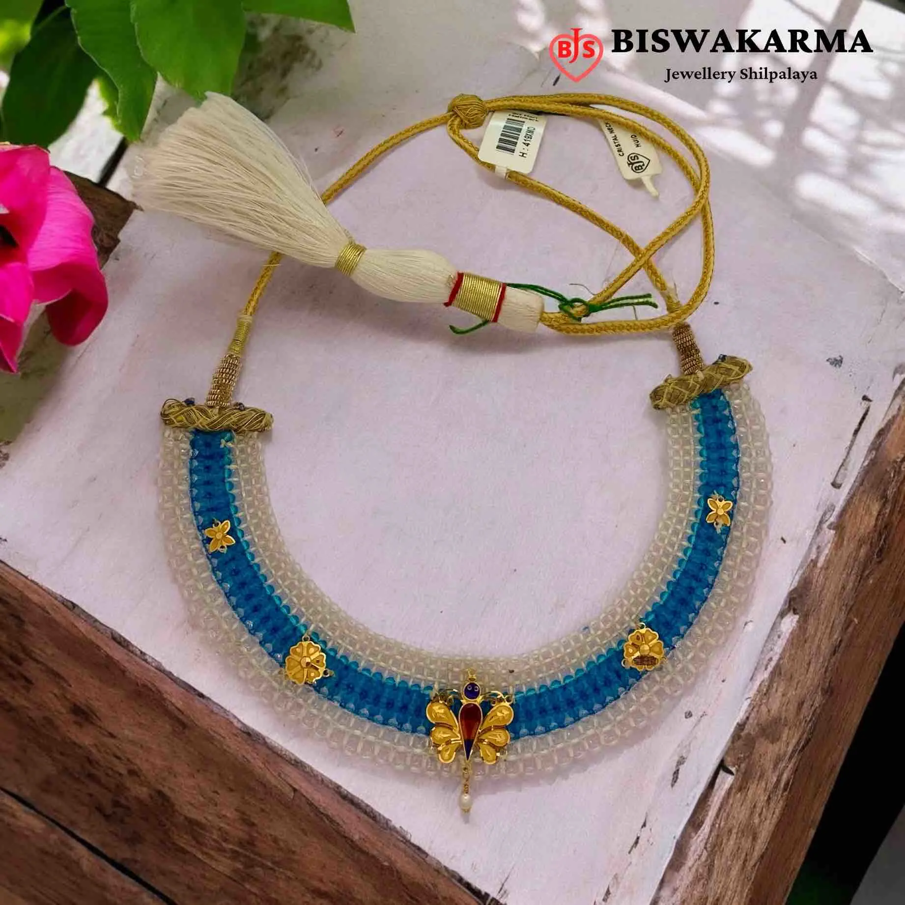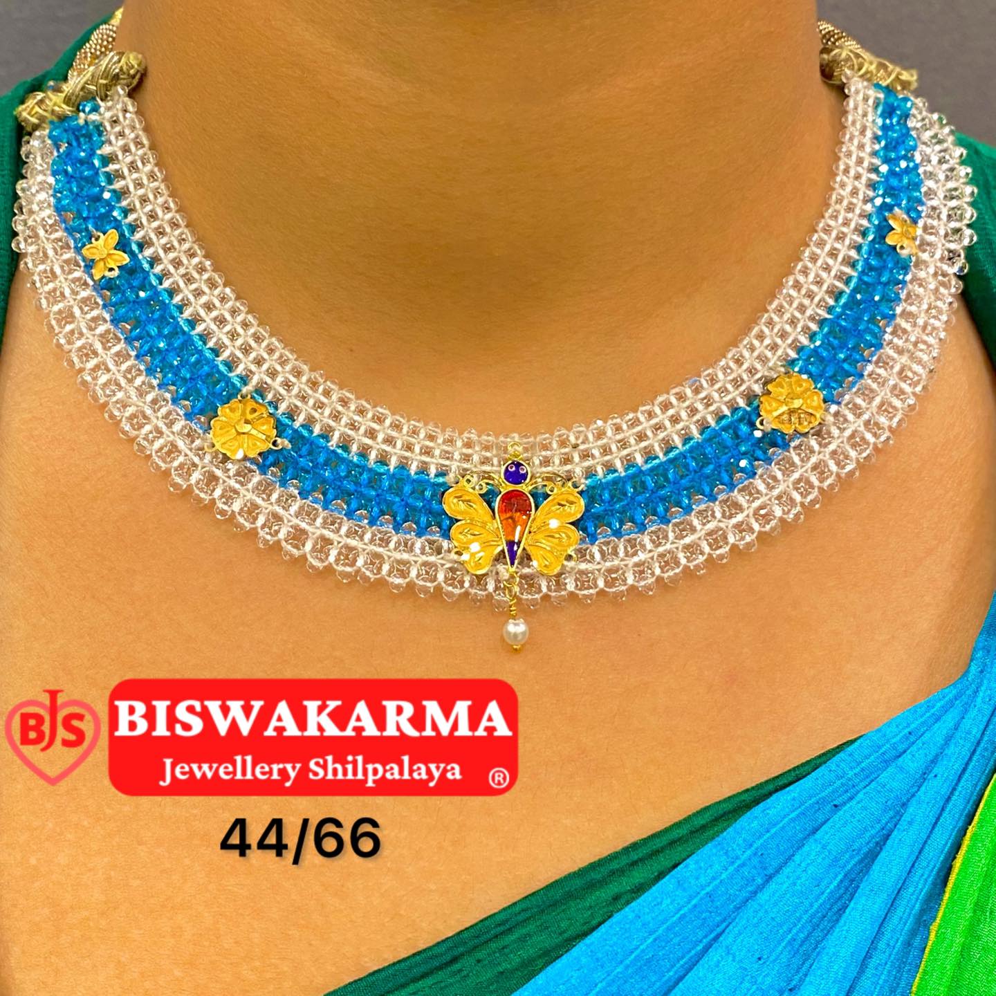 A serene blue crystal necklace adorned with golden floral and butterfly motifs, capturing the beauty of elegance and the calm of royal grace.