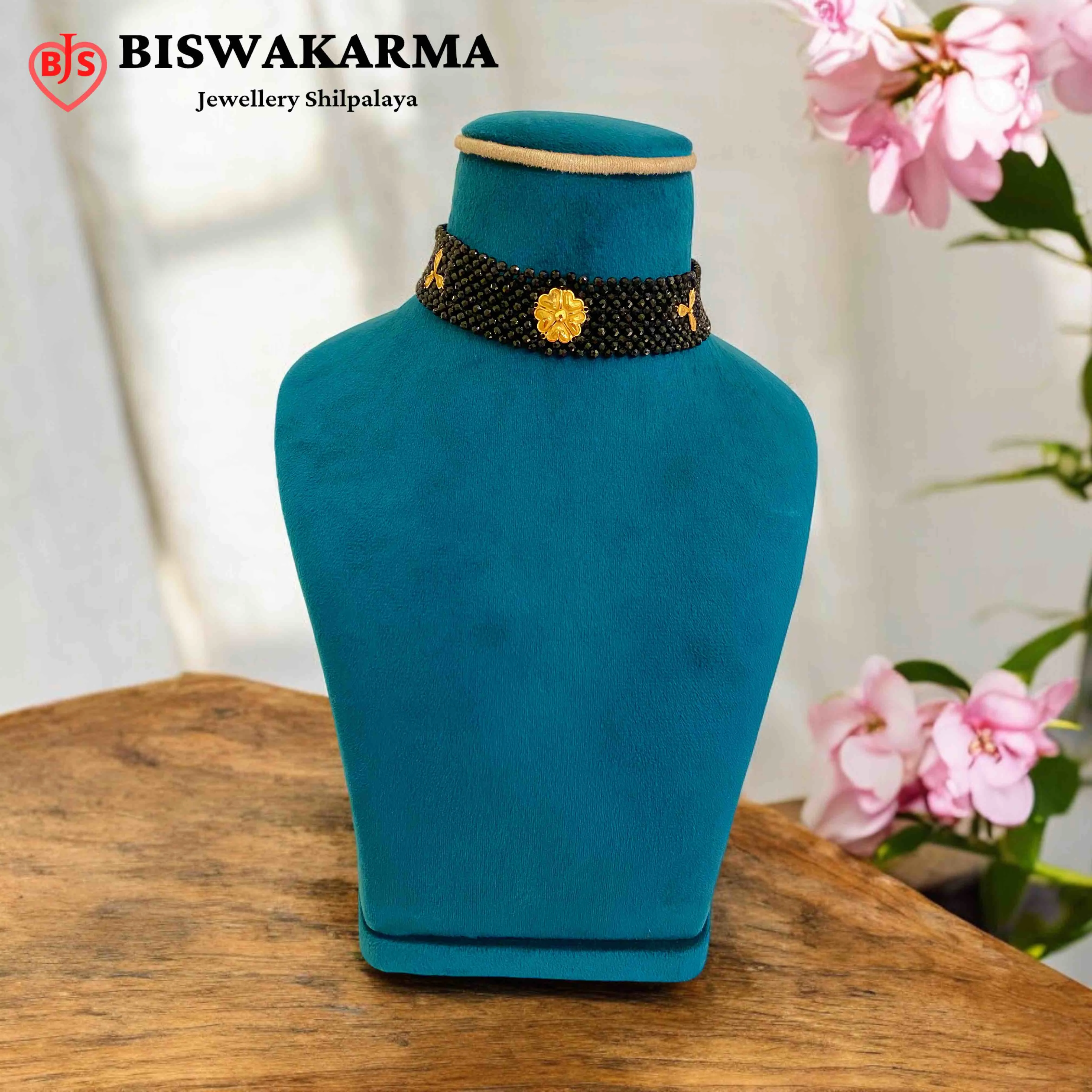 Tiny black beads sit close together, dotted with sweet golden floral crests. The neat finish and soft shine give it a gentle, eye-catching charm.