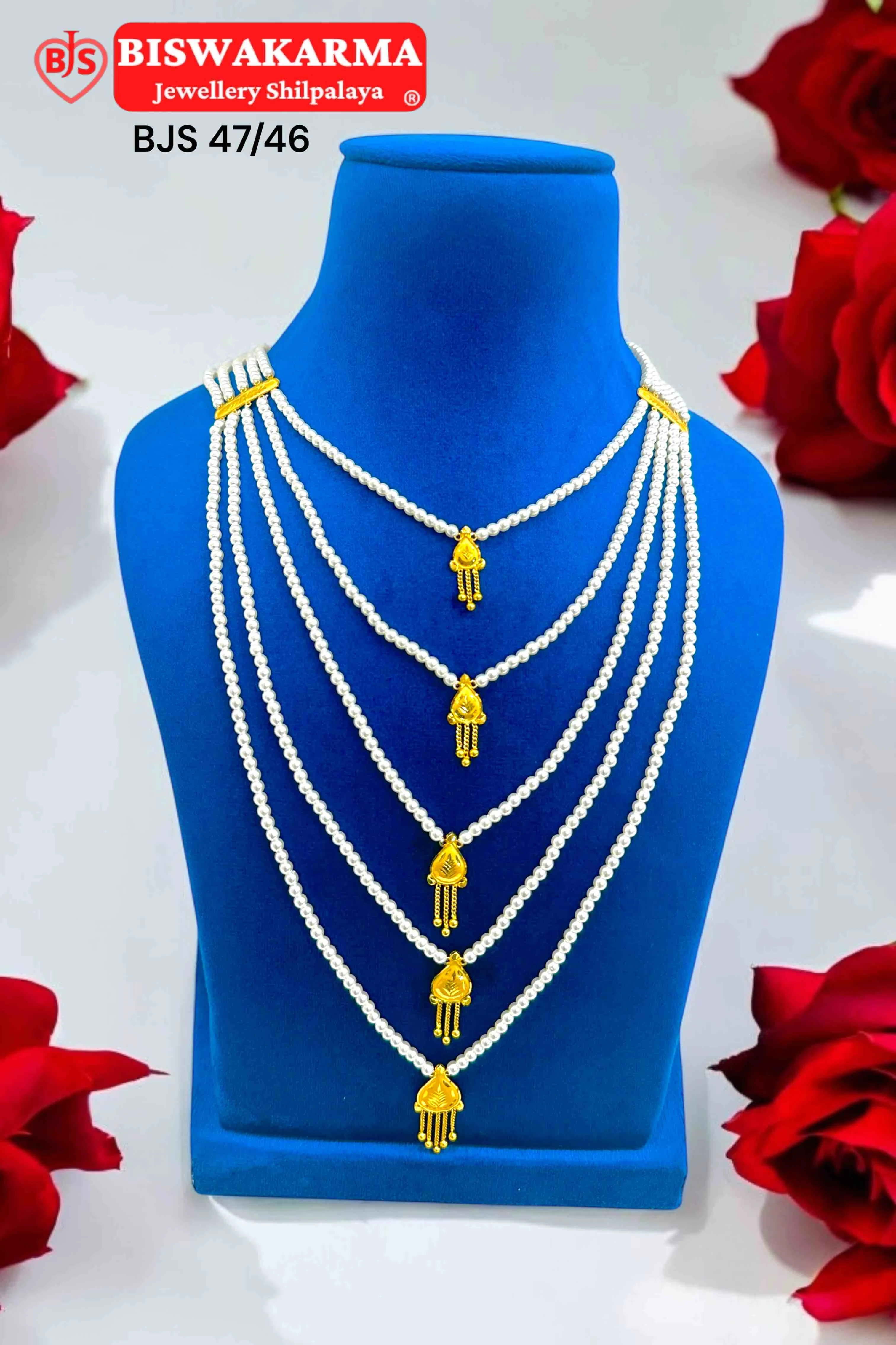 A magnificent five-layer pearl sitahar adorned with golden drop pendants, symbolizing grace, purity, and the timeless charm of royal tradition.