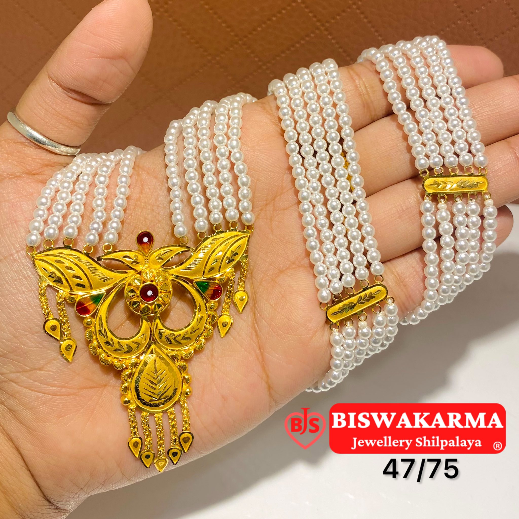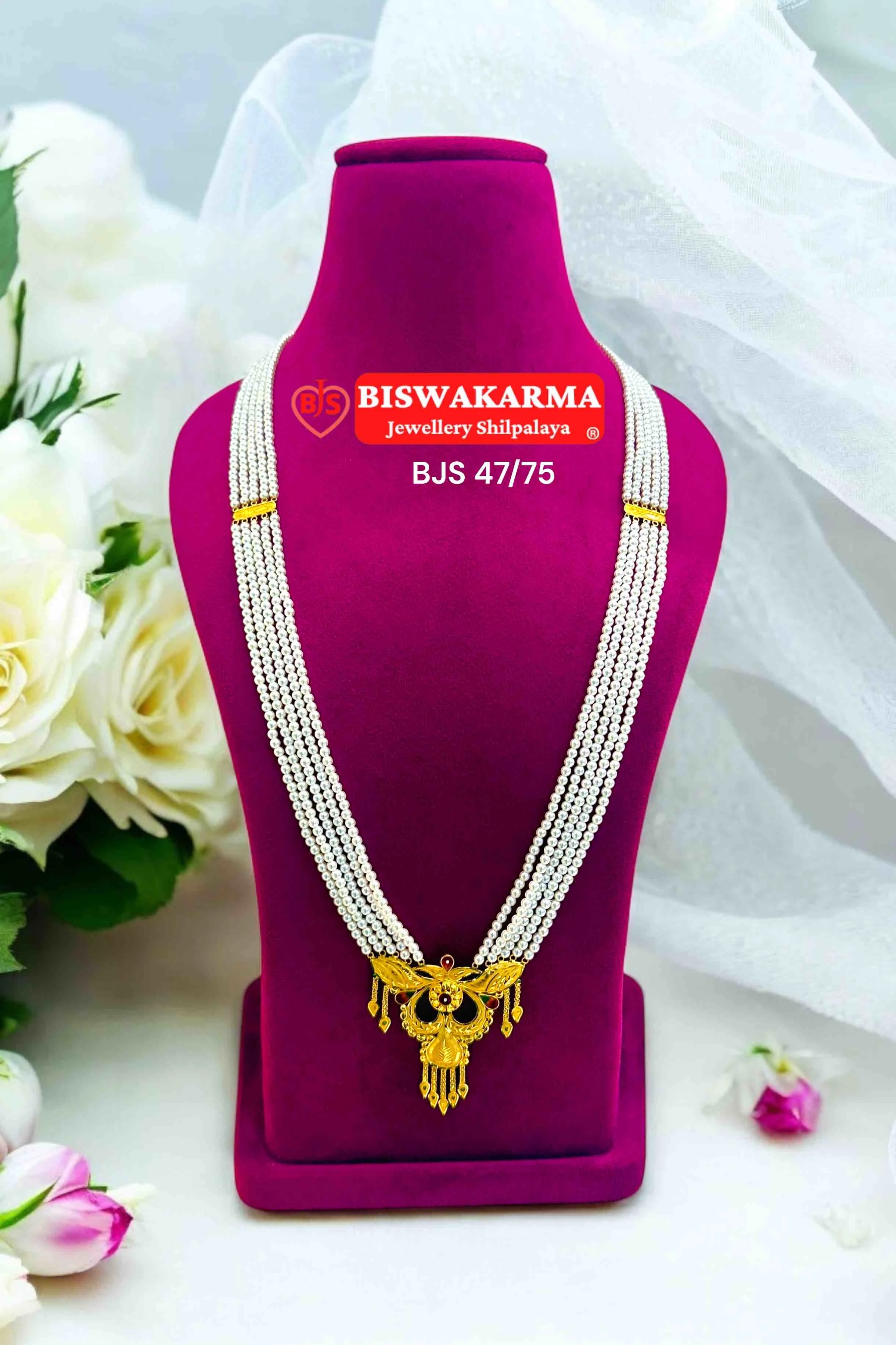 A graceful multi-strand pearl sitahar adorned with a golden peacock pendant, symbolizing beauty, royalty, and the timeless charm of tradition.