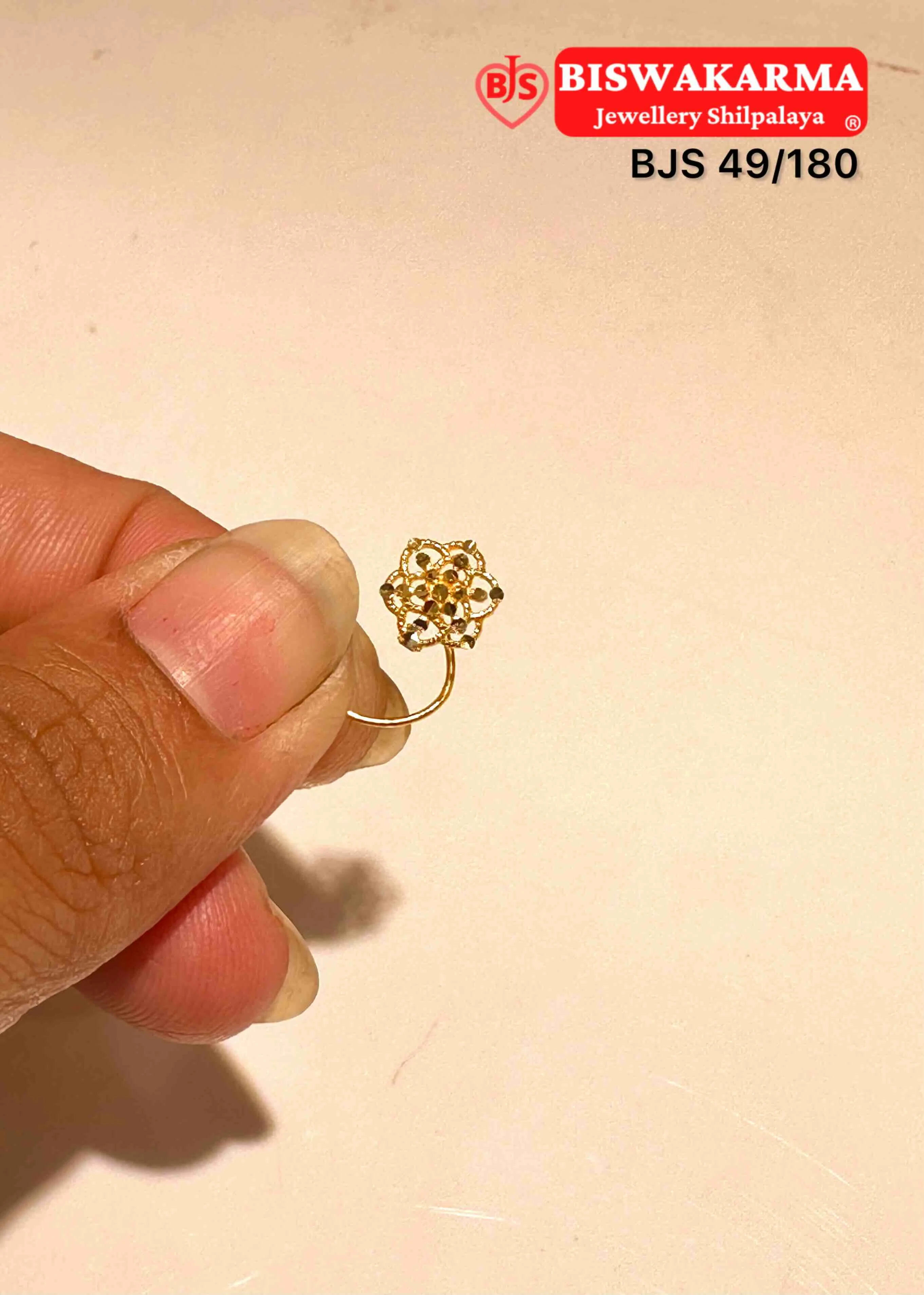 Tiny gold petals form a neat little bloom with soft dotted details inside. The gentle layers and warm shine give it a sweet, handcrafted charm that feels quietly lovely.