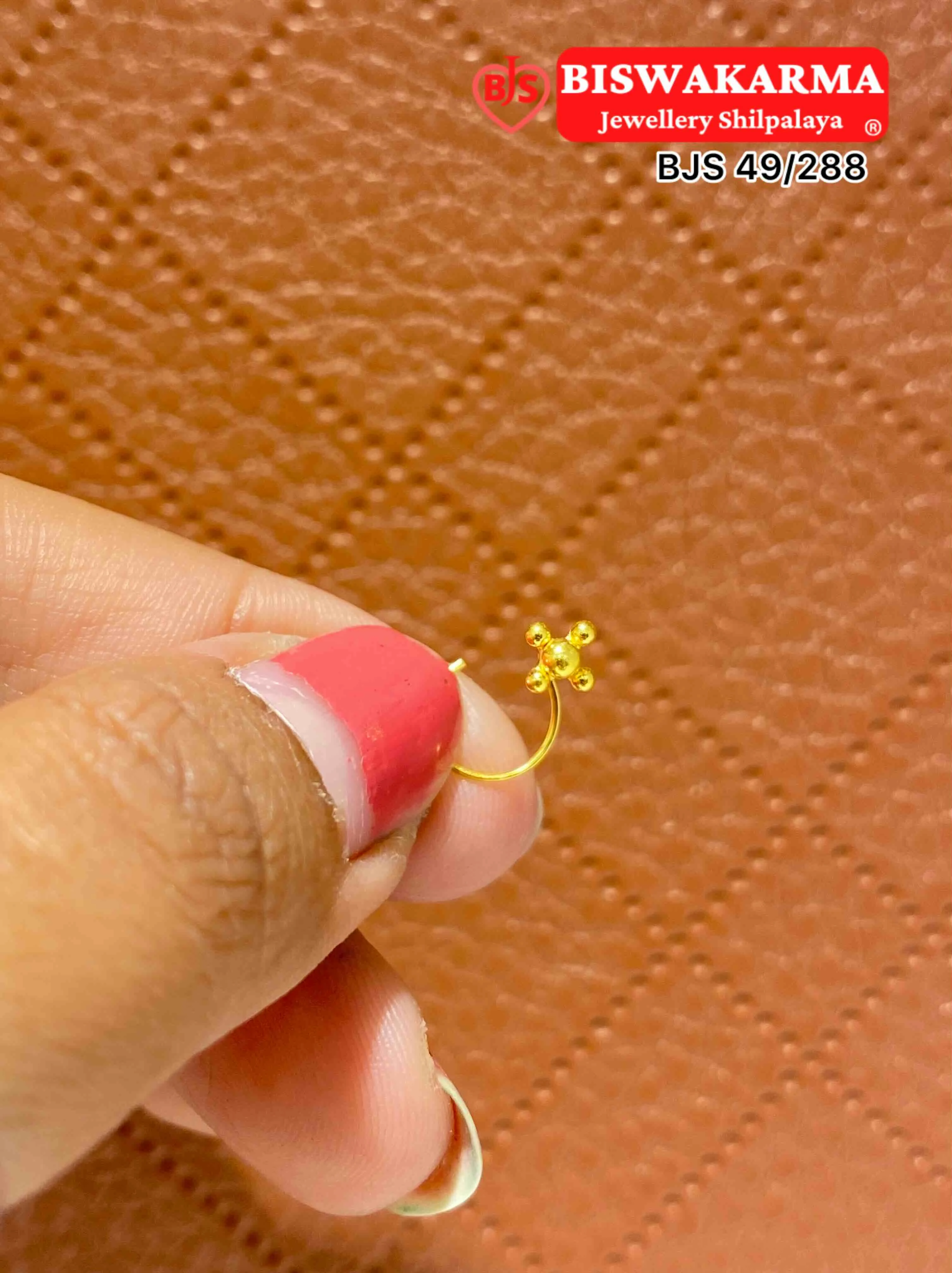 A tiny flower formed with smooth gold beads arranged in soft, even petals. The round shapes and gentle shine give the little piece a warm, sweet charm.