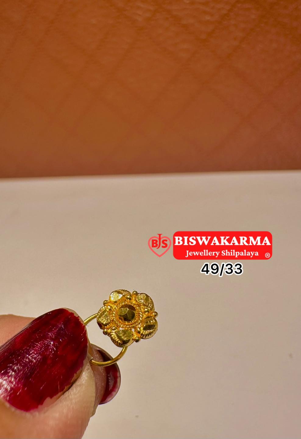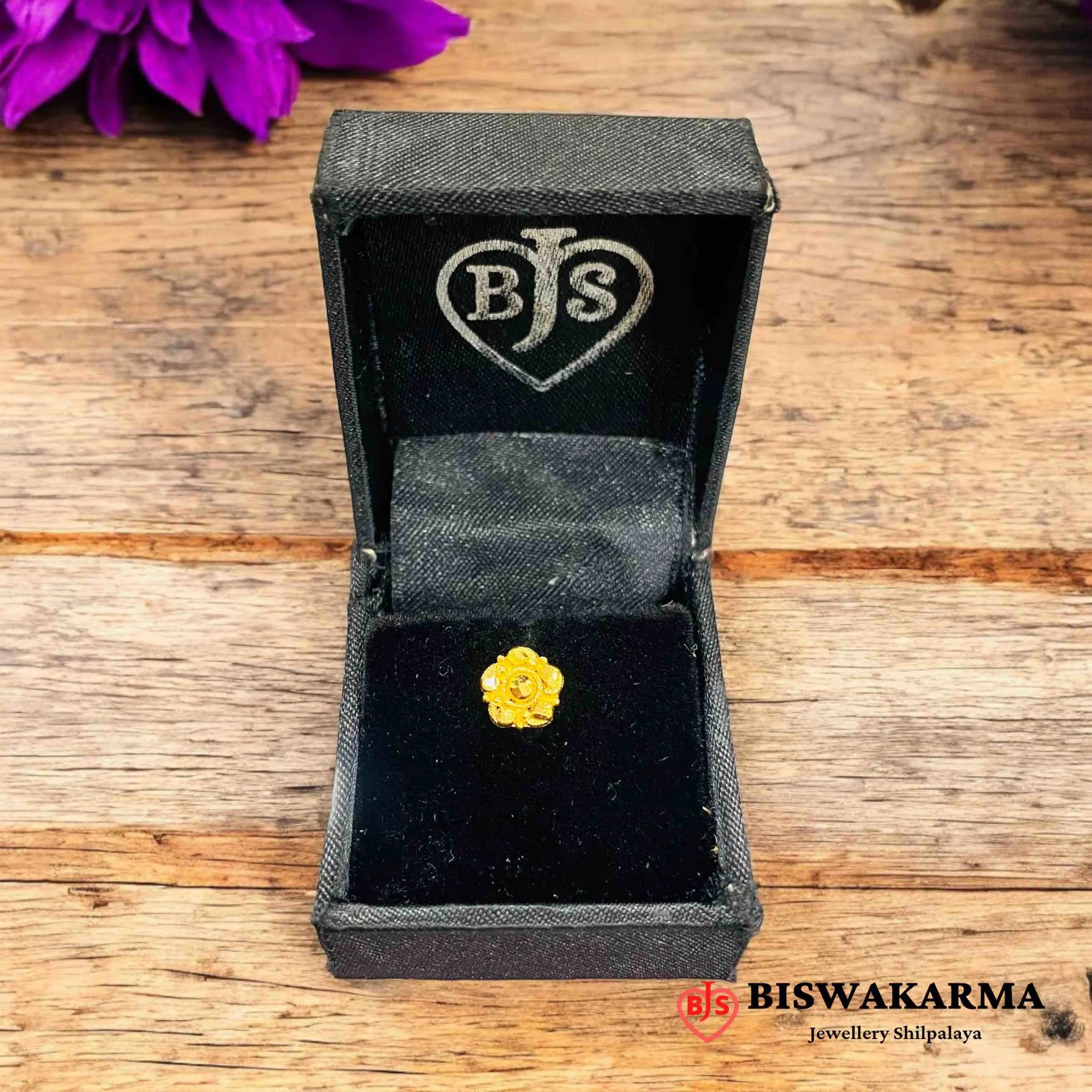 A tiny gold nosepin shaped like a neat layered petal. Its soft round form and clean cutwork give a warm, glowing charm in a simple, sweet style.