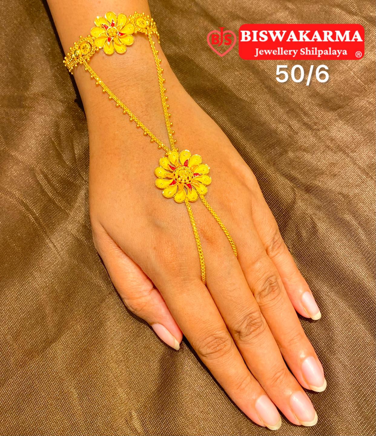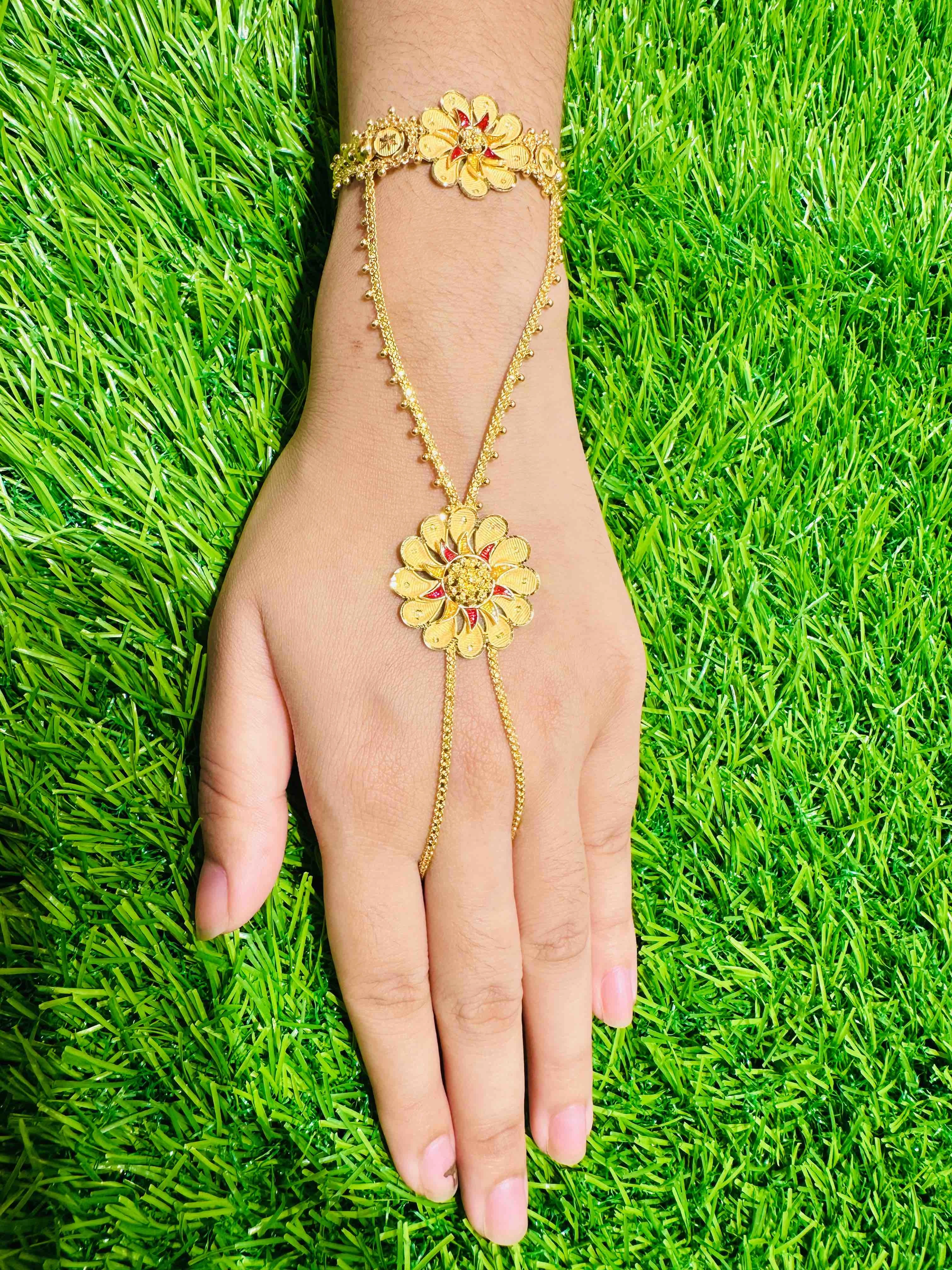 A beautiful gold floral ratan chur handpiece featuring vibrant enamel work and delicate chain detailing, adding a royal and elegant touch to your look.