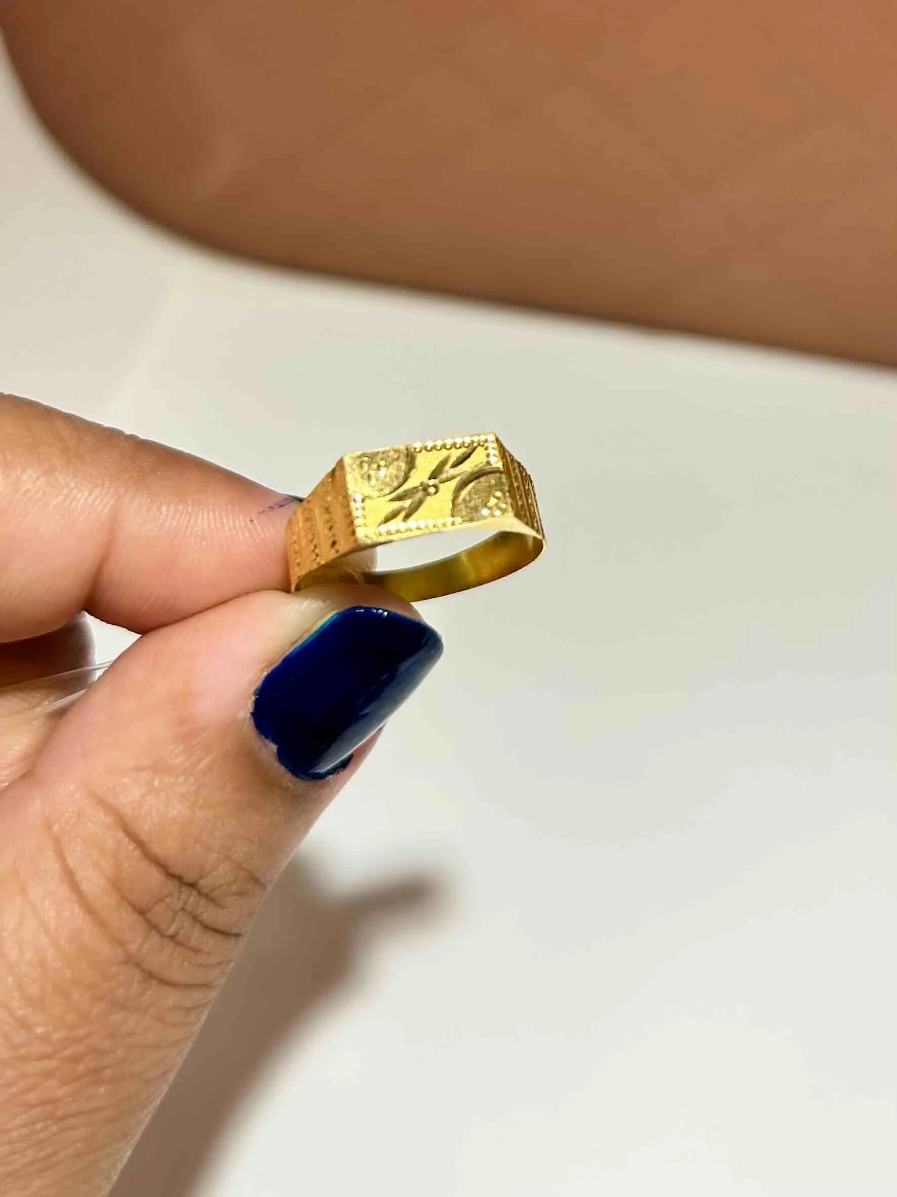 This gold baby ring has a square top with a star design and fine edge dots. Its bright shine and neat shape give it a royal, polished look.