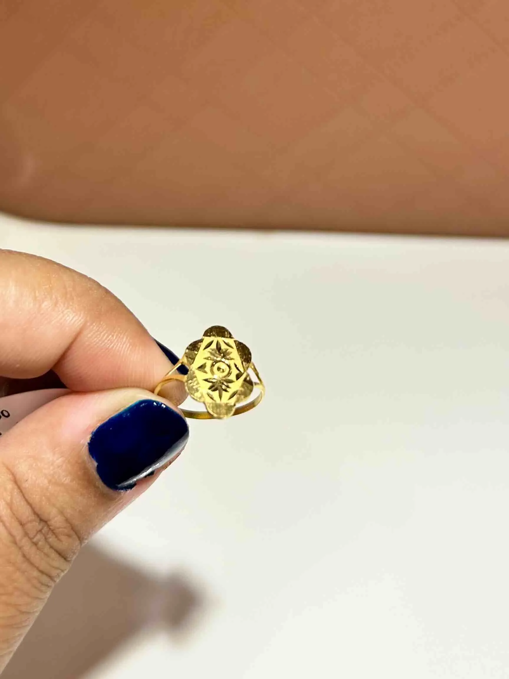 A gold baby ring with a hexagon top and compass-style star engraving. Its shiny finish and neat cuts give it a bright, elegant look.