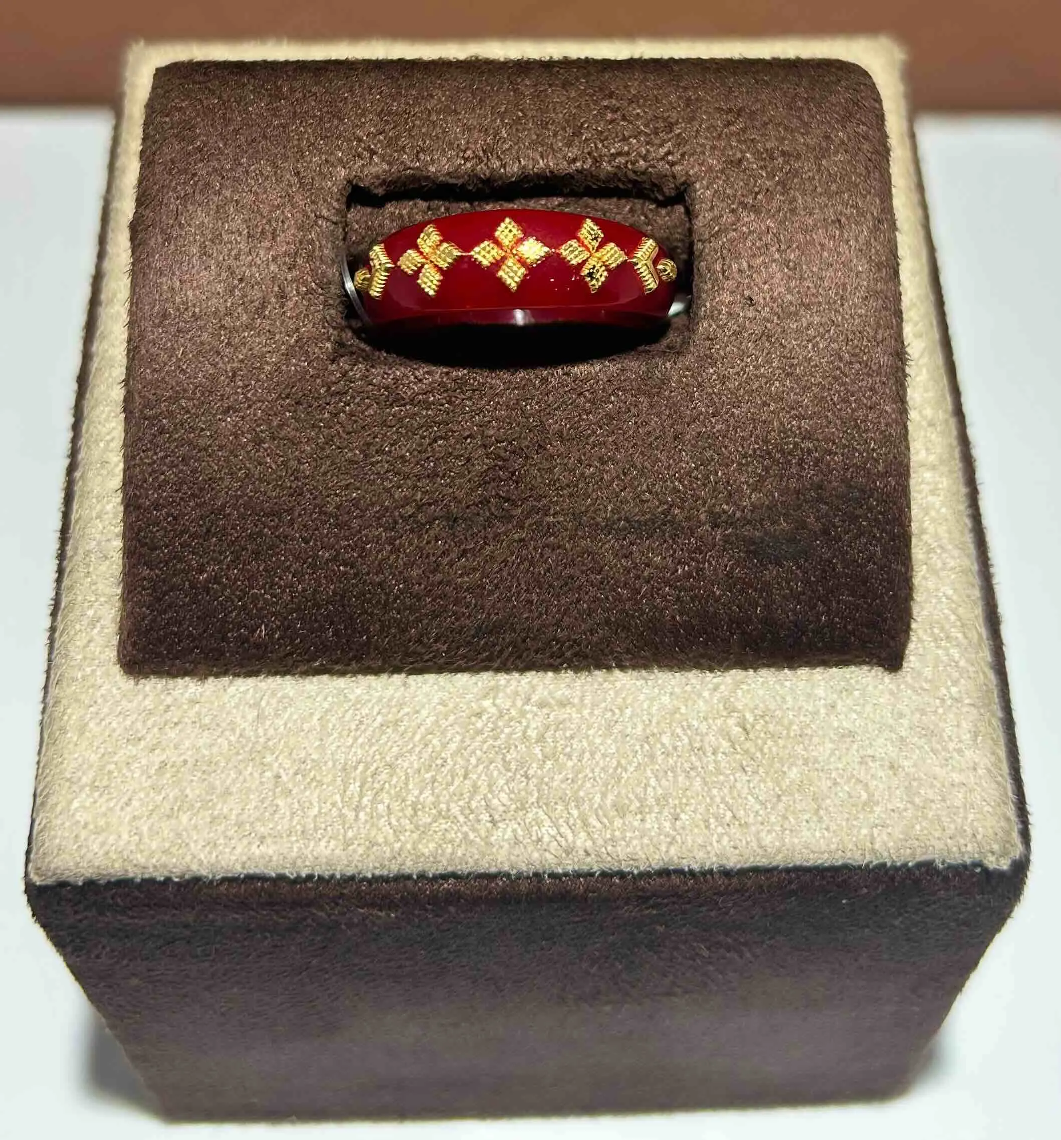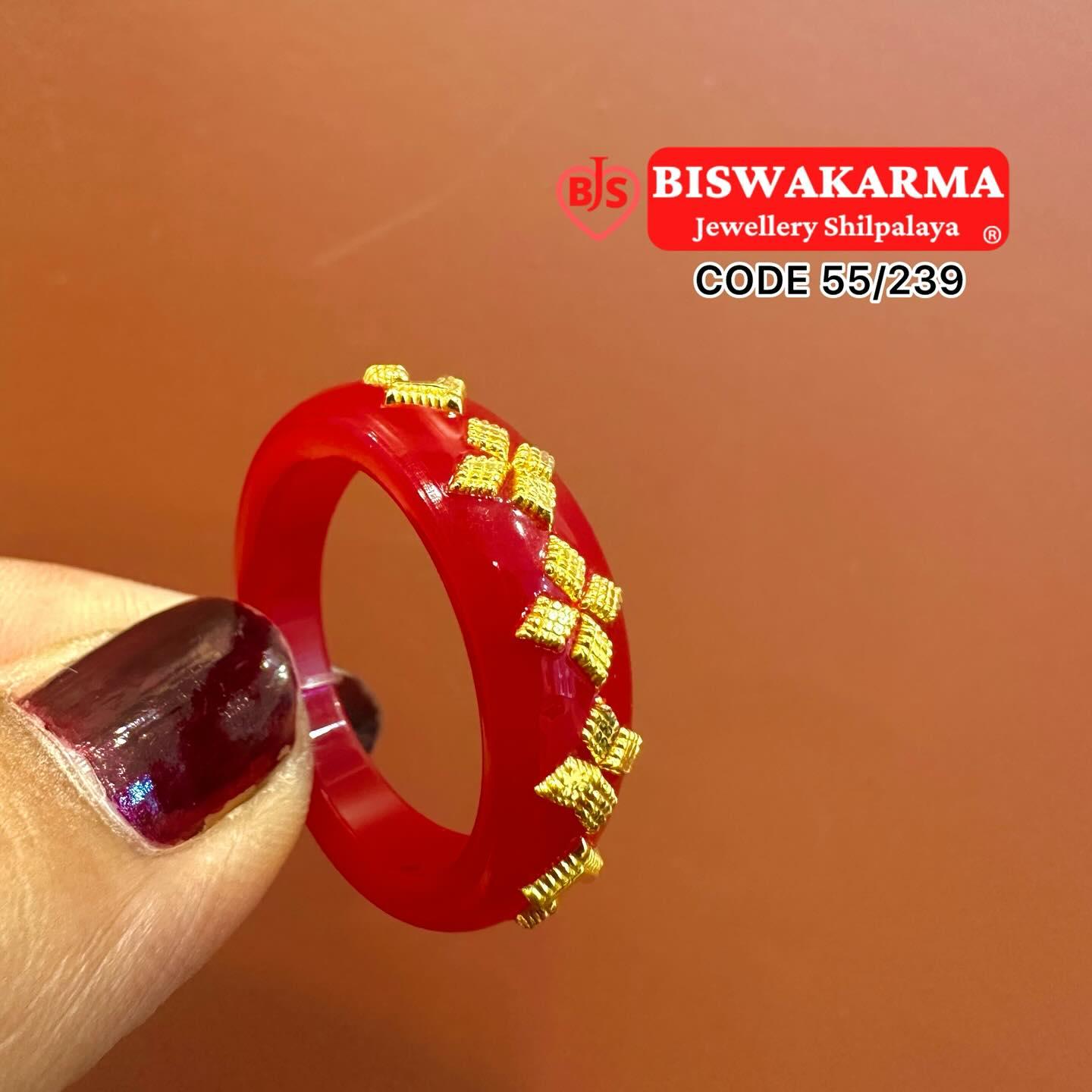 A red pola ring crafted with criss-cross golden weave patterns — symbolizing love, unity, and timeless Bengali artistry.