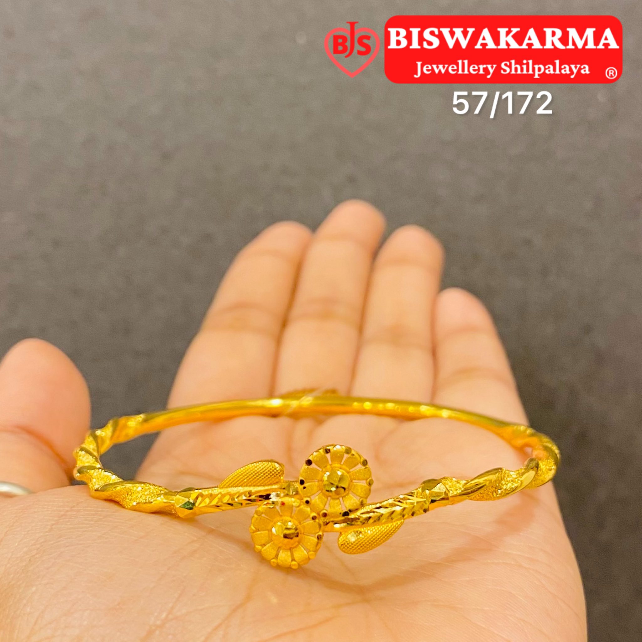 Elegant gold cover bangle with twin floral motifs and twisted detailing, designed to add a soft, radiant touch to your daily elegance.