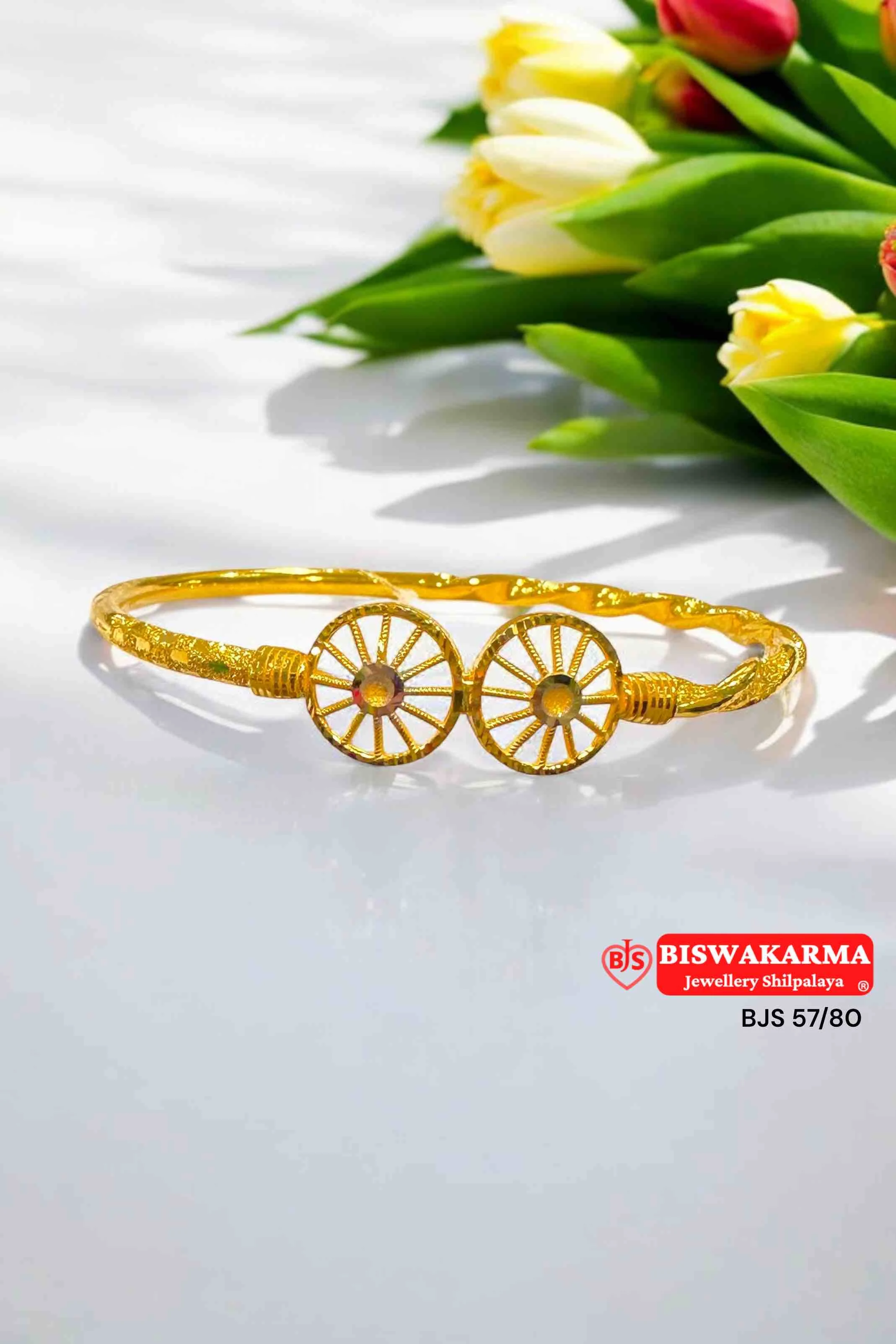 A radiant gold cover bangle featuring twin wheel motifs—symbolizing progress, strength, and eternal elegance in every detail.