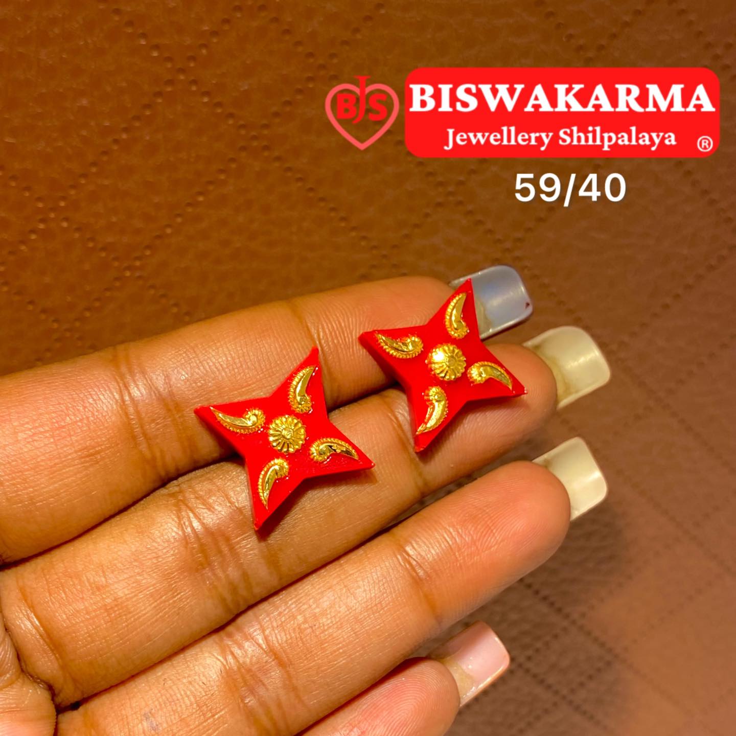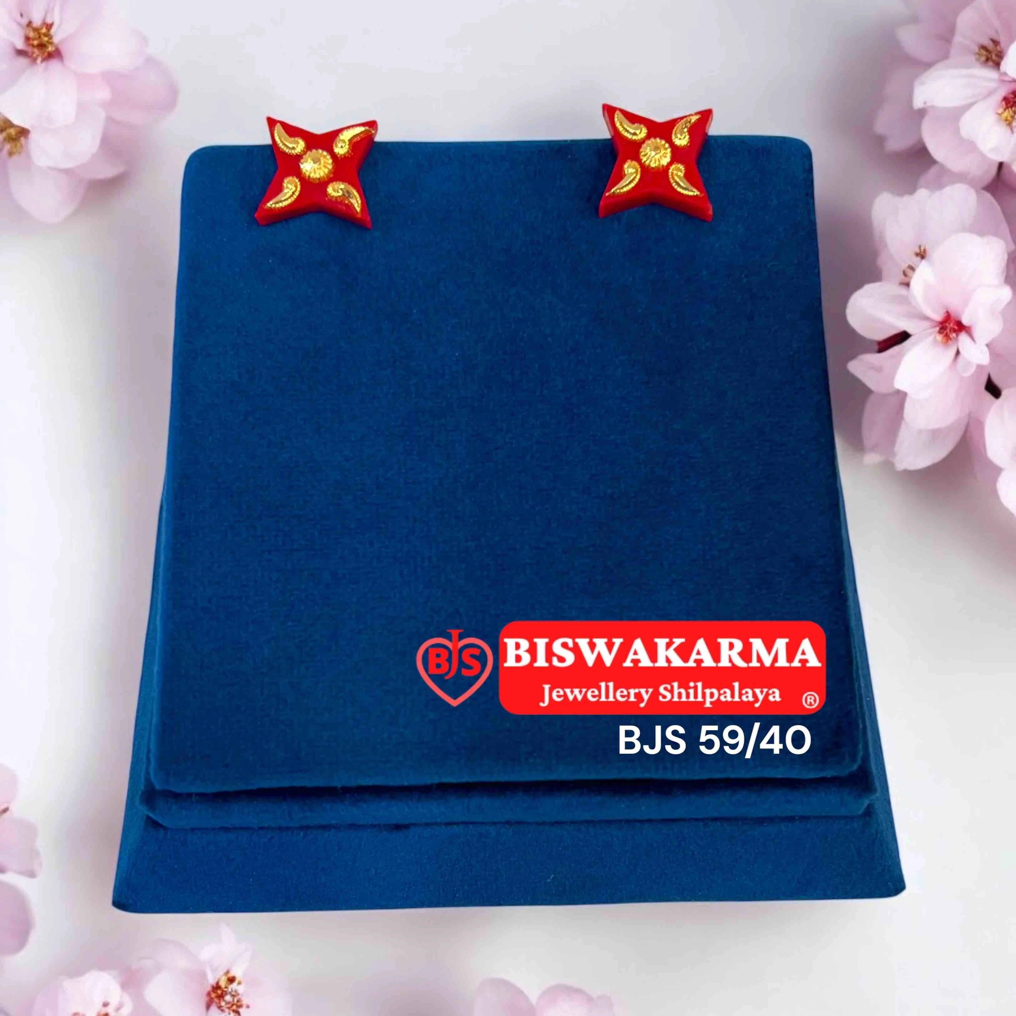 Unique red pola earrings in star shape with golden dot detailing, symbolizing joy and radiance while adding a bright festive charm.