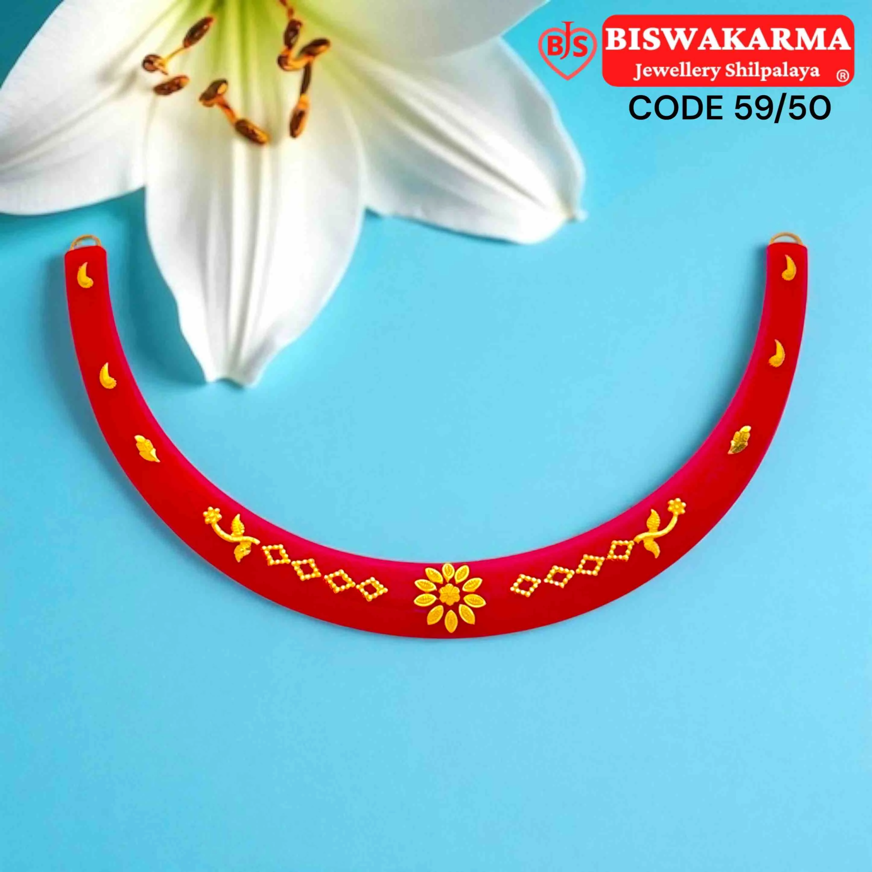 A radiant red pola necklace featuring moon and floral gold motifs, blending traditional artistry with graceful elegance and divine charm.
