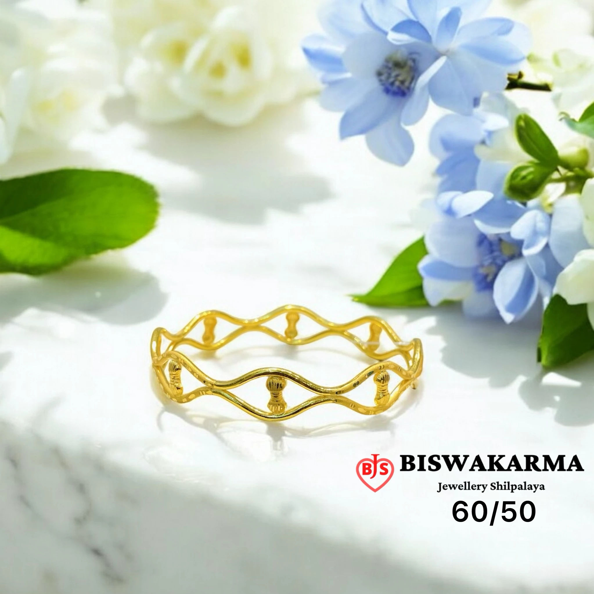 Open wave bangle built in flowing gold lines. Small raised bar forms set between curves. Frame shaped by hand, surface bright, edges rounded smooth.