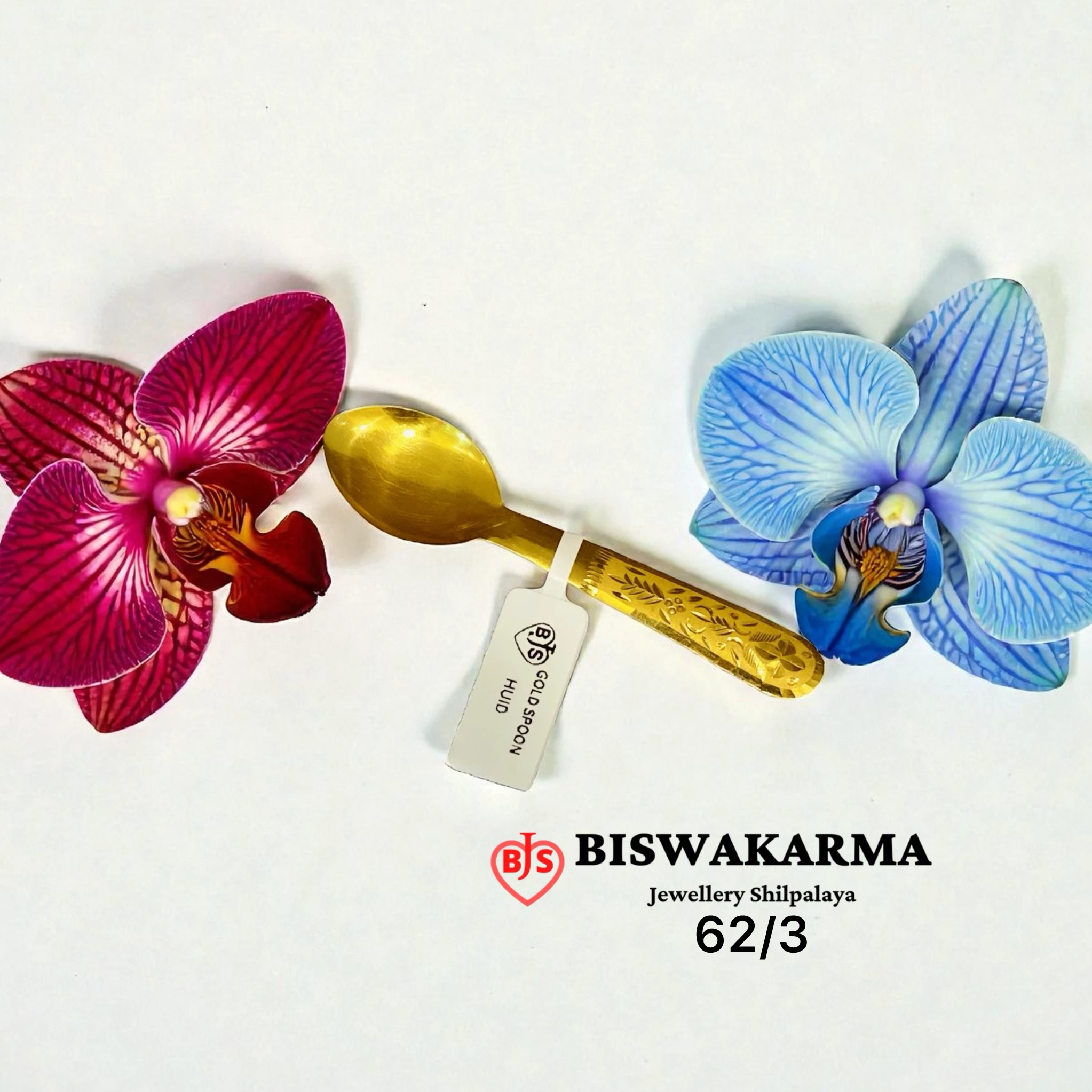 Solid gold spoon shaped by hand. Oval bowl formed smooth with a deep curve. Handle cut with leaf pattern lines and fine edge work. High-polish surface with firm, balanced grip.