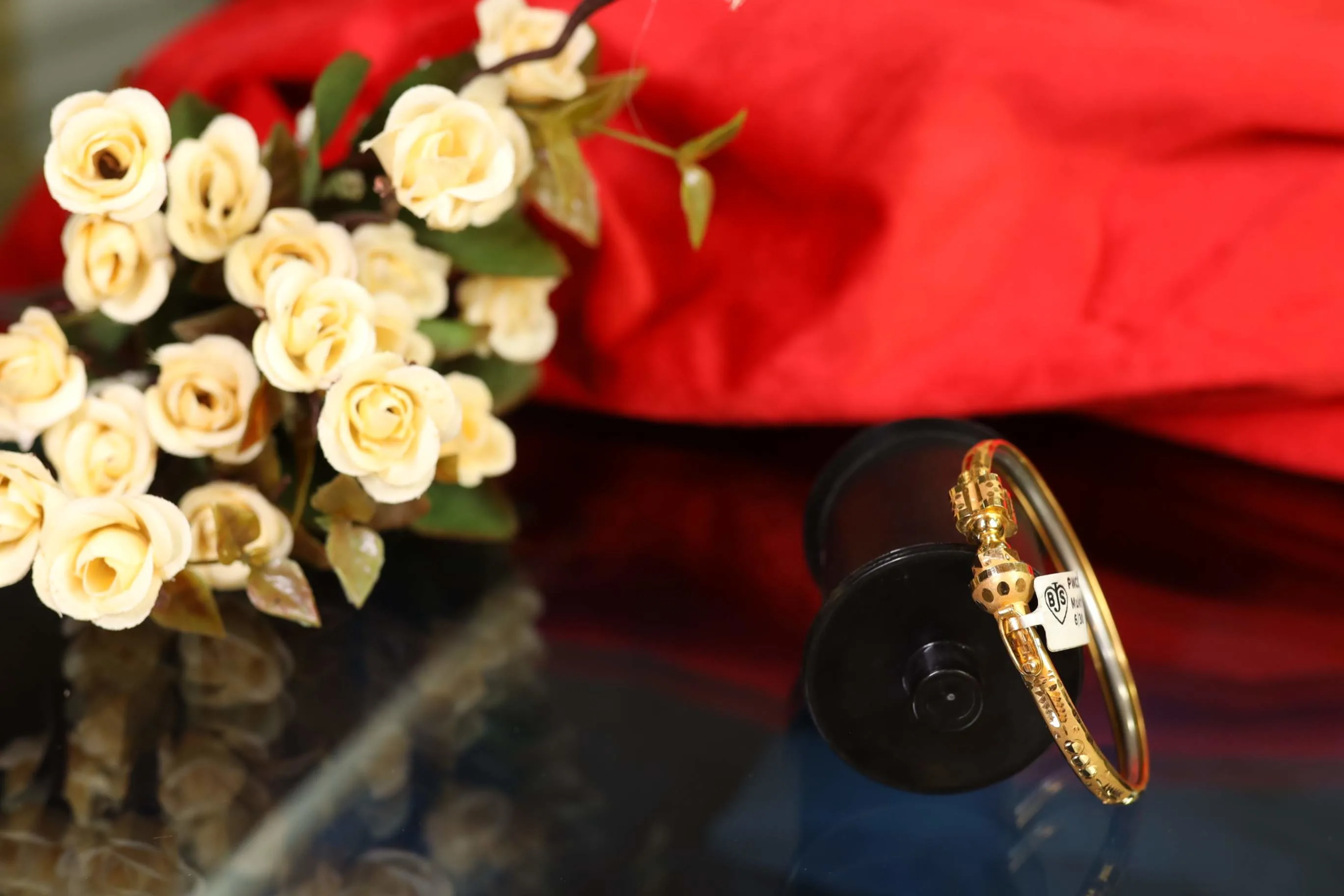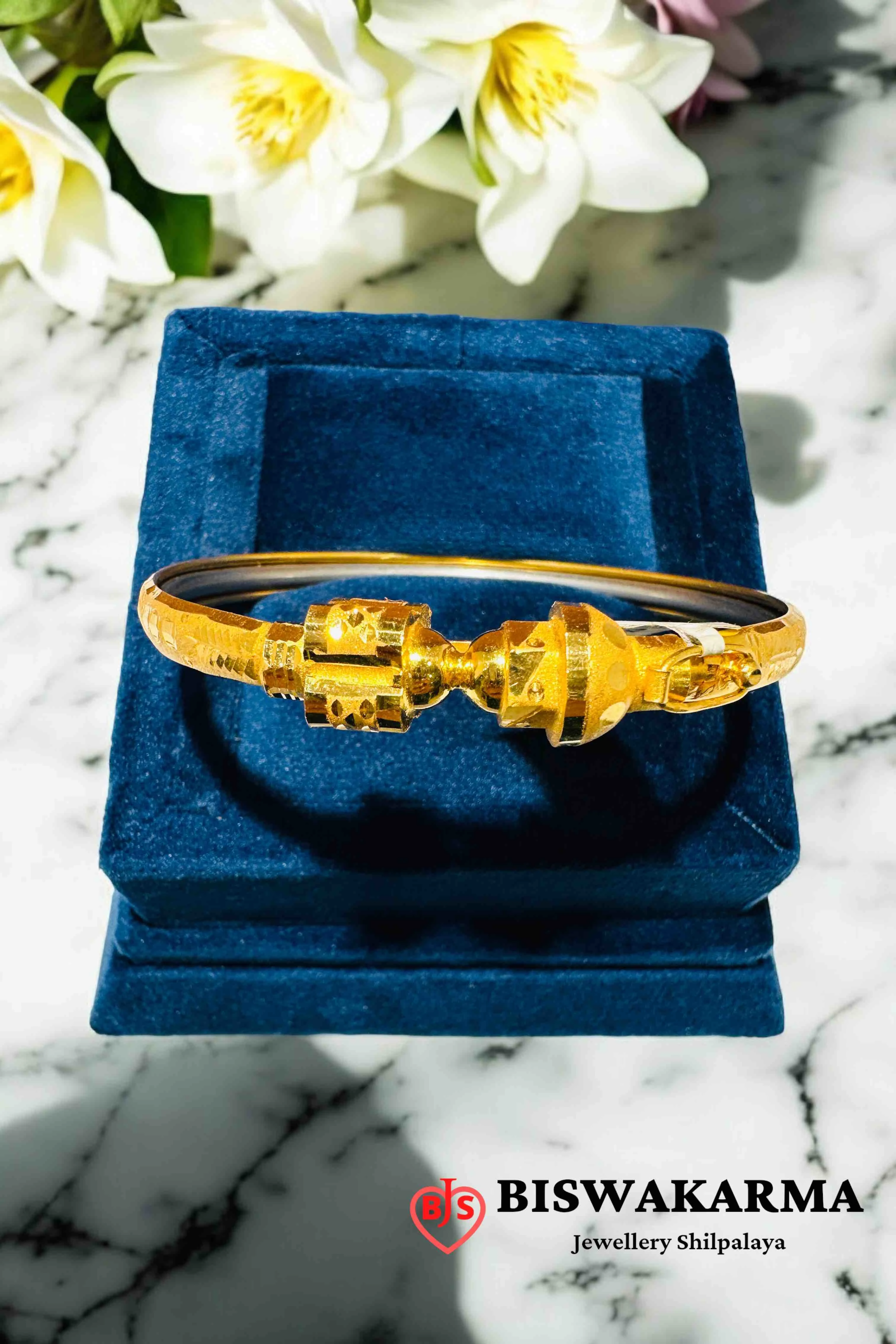 Bold geometric blocks meet at the center, shaped with sharp edges and neat dotted cuts. The strong form and bright gold shine give it a striking, modern charm.