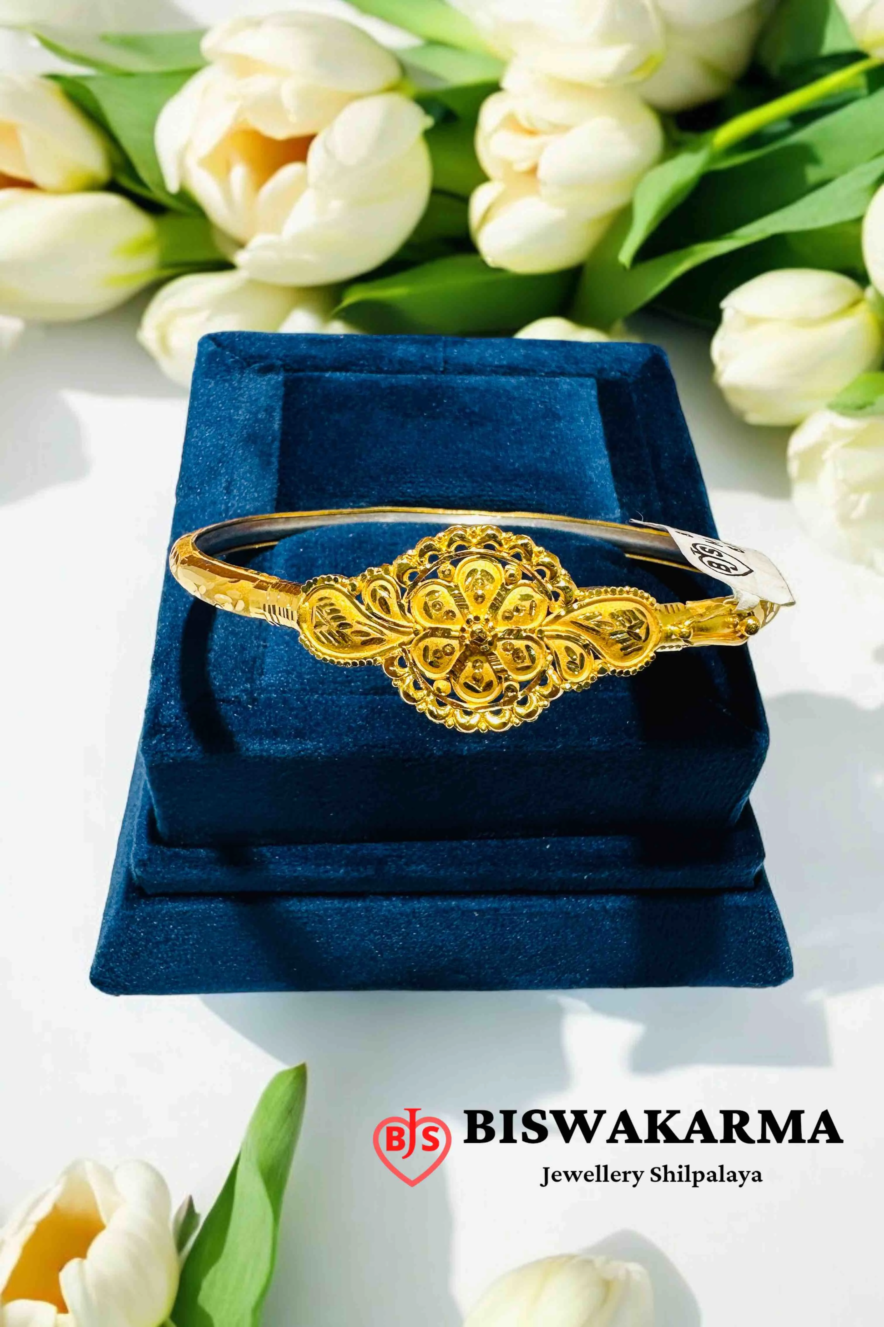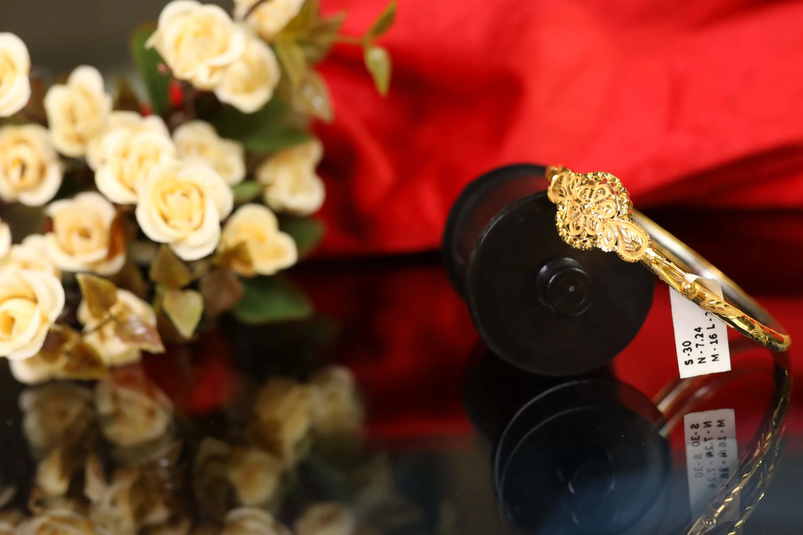 A blooming floral dome sits at the center, filled with tiny mesh cuts, curved petals, and dotted details. The layered design and bright shine give it a rich, graceful charm.