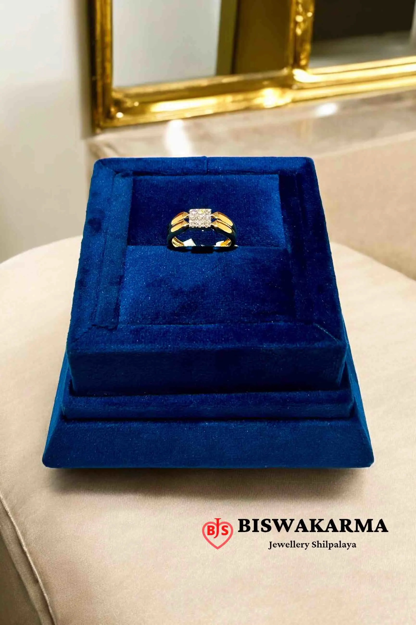 A bold gold gents ring featuring a square diamond cluster with detailed side grooves — perfect for men who love strong and elegant designs.