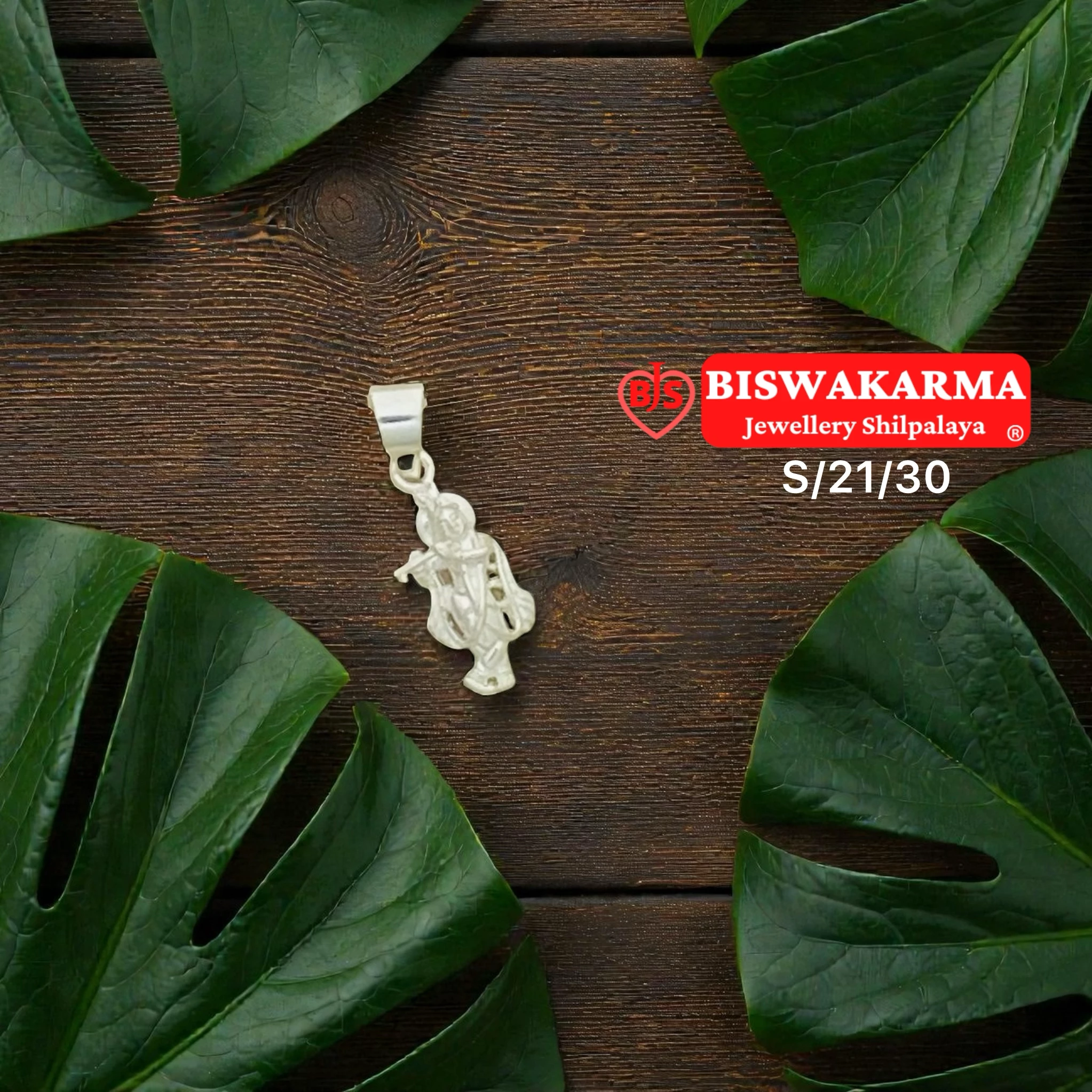 Solid silver Krishna form with open-cut body. Flute and drape shaped by hand file. Deep recess work keeps figure light. Plain bail soldered neat. Polished raised lines.