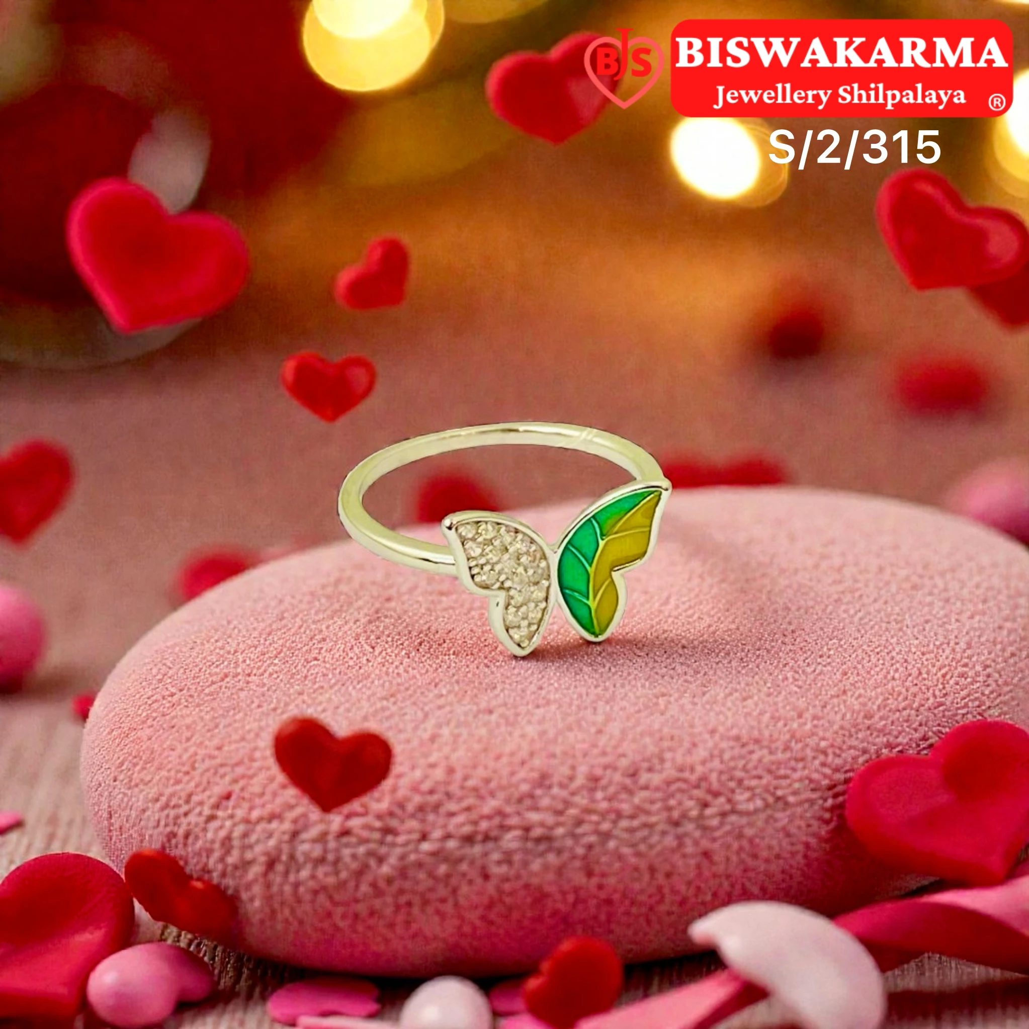 Butterfly ring with split wings. One wing hand-filled in green and yellow enamel with leaf cuts. Other wing deep-set with fine stones. Slim silver band, soft curve.