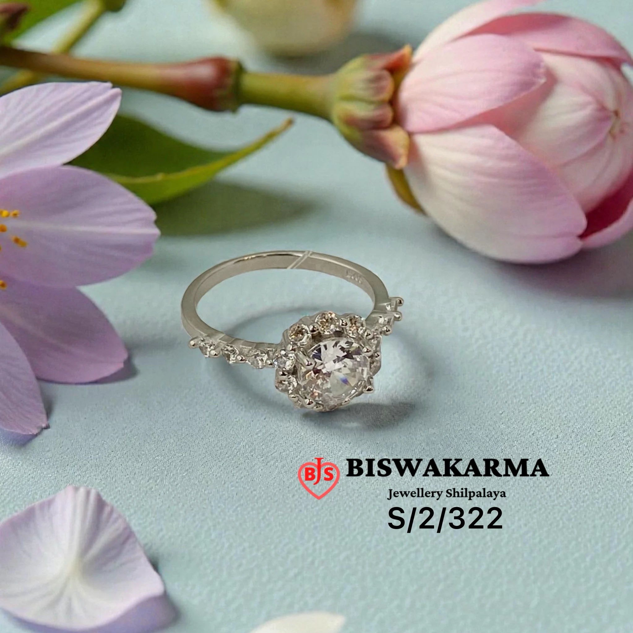 Silver ring with a round center stone held in raised prongs. Small stones form a crown halo and run partway on the band. Solid build, smooth inner finish.