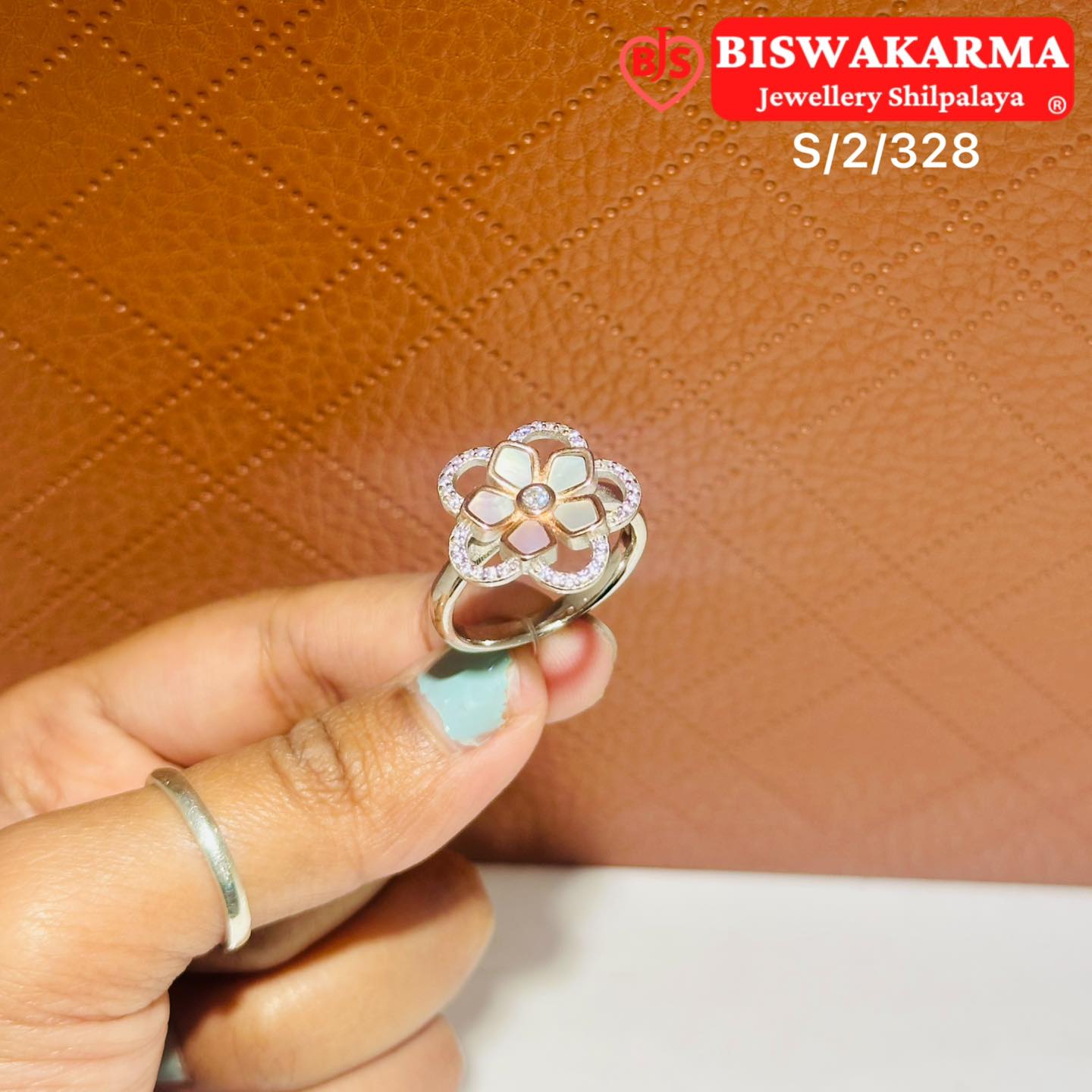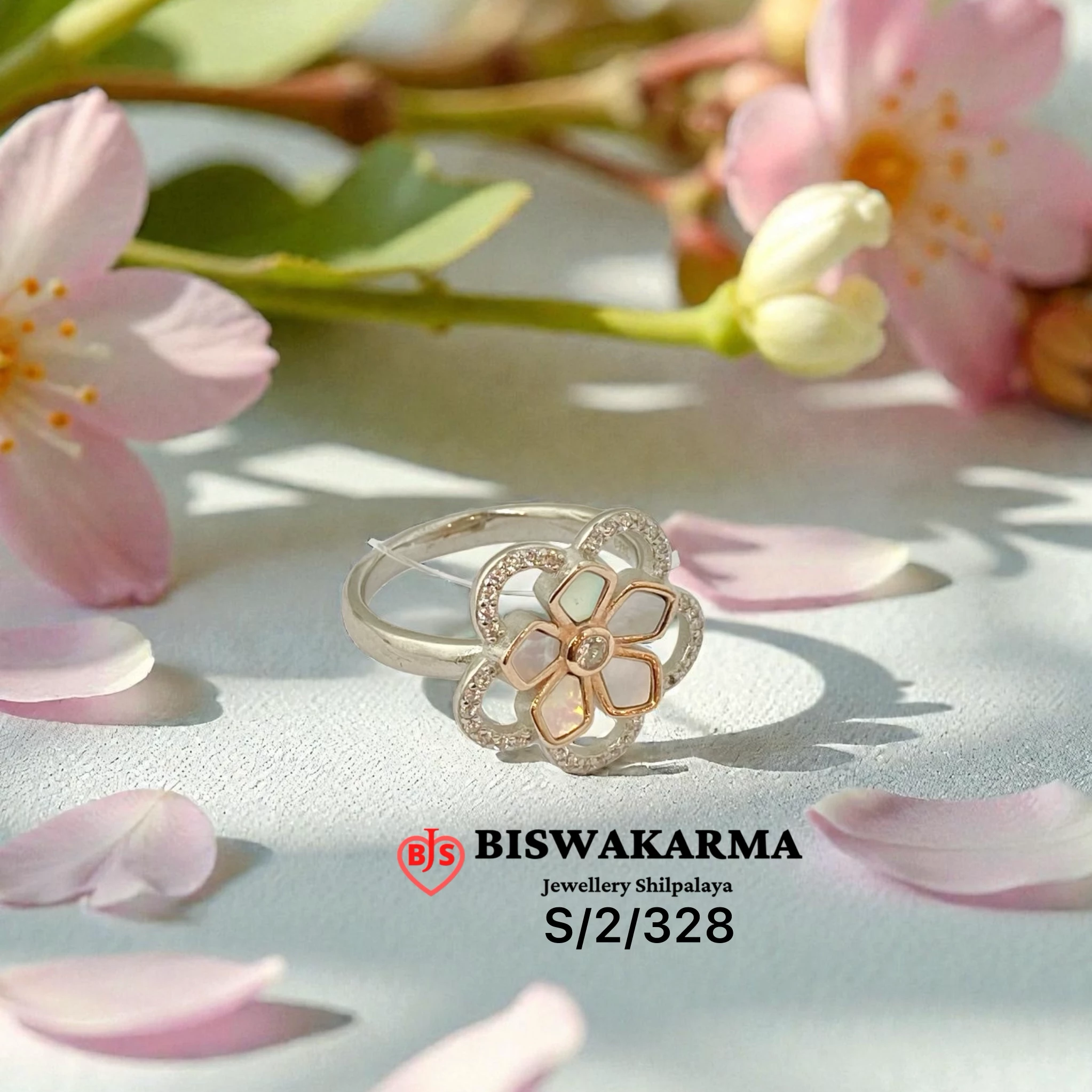 Slim silver ring with an open flower top. Rose-tone petals are cut clean and set raised. Clear stones line the outer frame. Flat band, smooth inner finish.