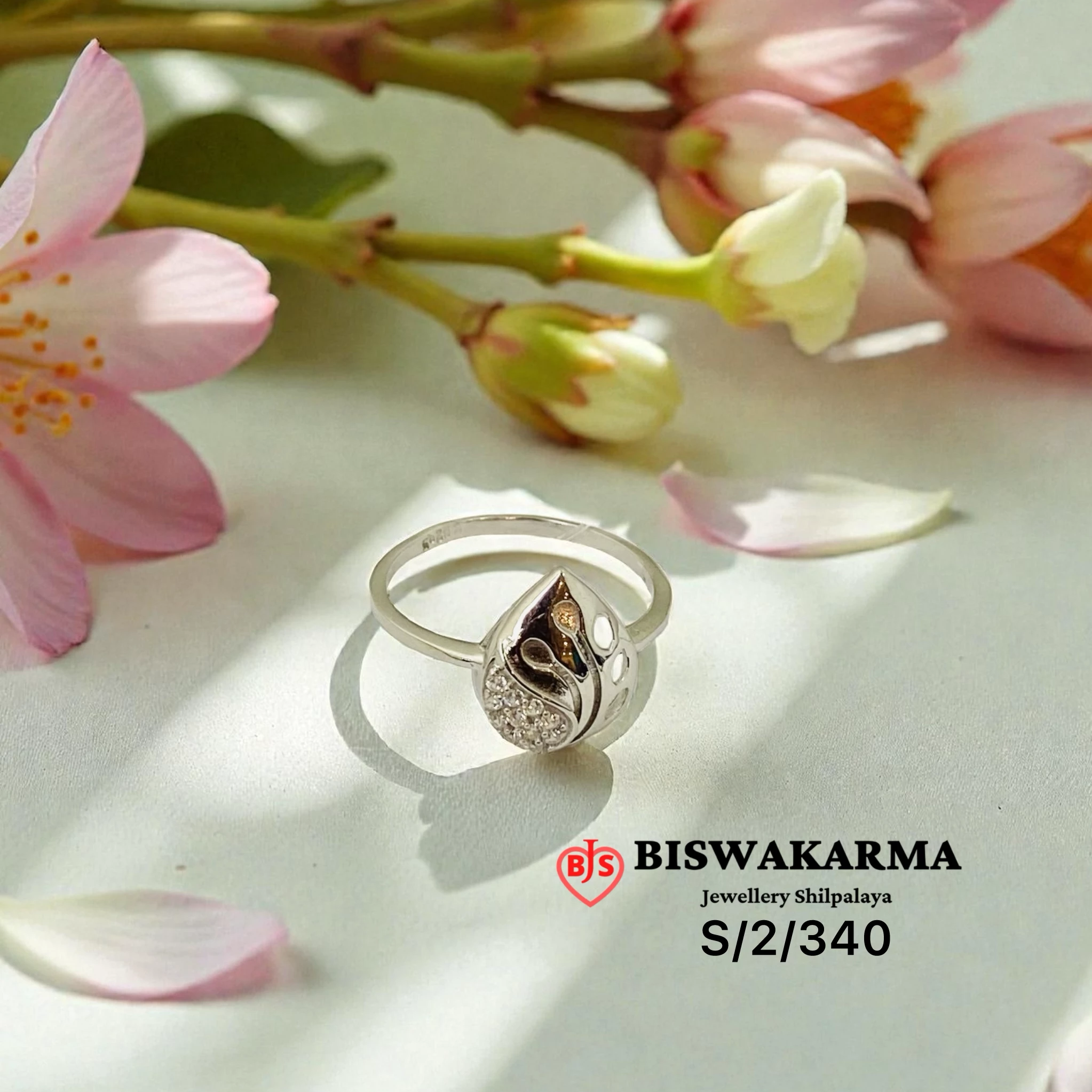 Silver ring with a teardrop leaf head. One side is mirror-polish cut, the other holds tight-set stones in a deep pocket. Open back, smooth band finish.