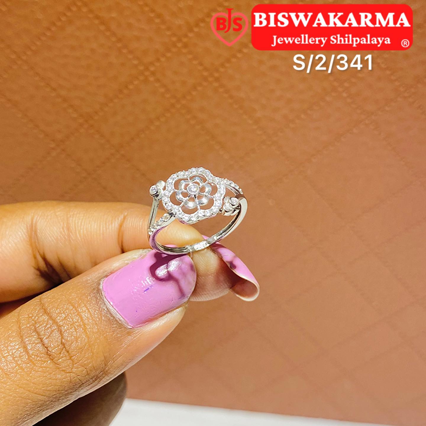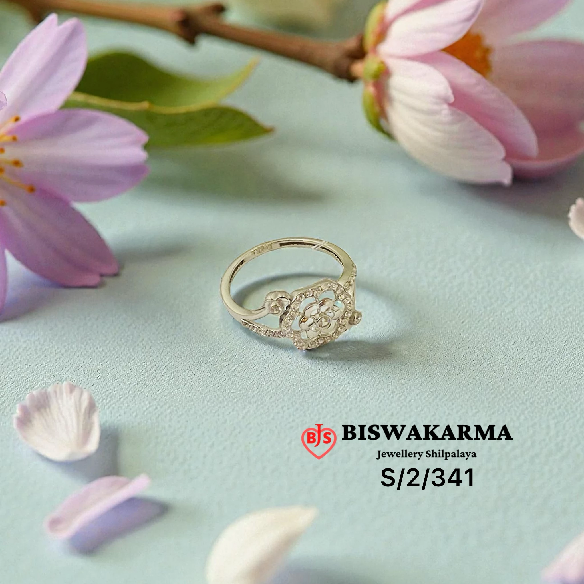 Open flower head cut in fine wirework. Tiny stones sit flush around the face and shank. Center kept airy, edges hand-finished smooth.