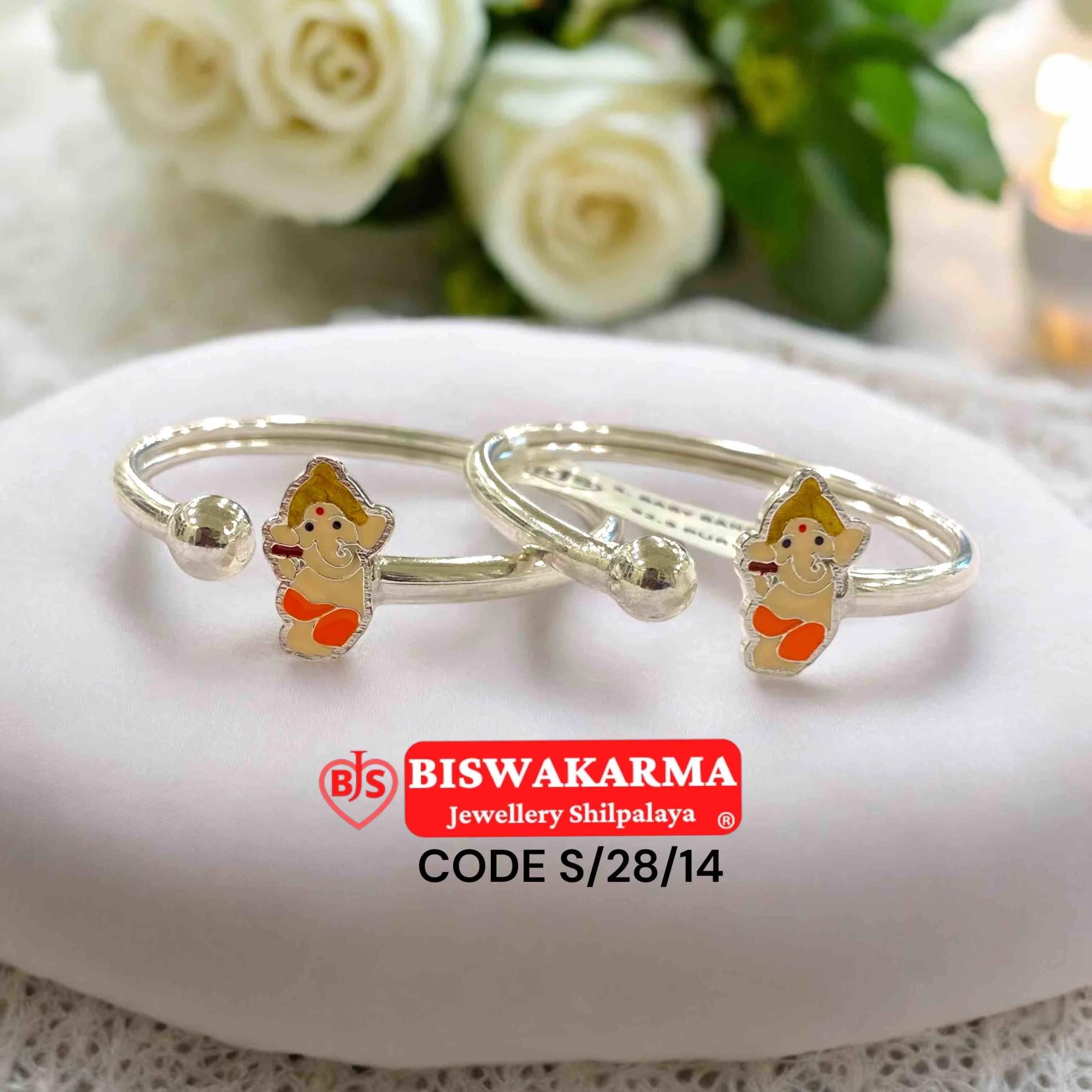 A baby Ganesha motif sits on a smooth silver band, paired with a neat round end. The cute pose and bright colors give it a warm, joyful charm.