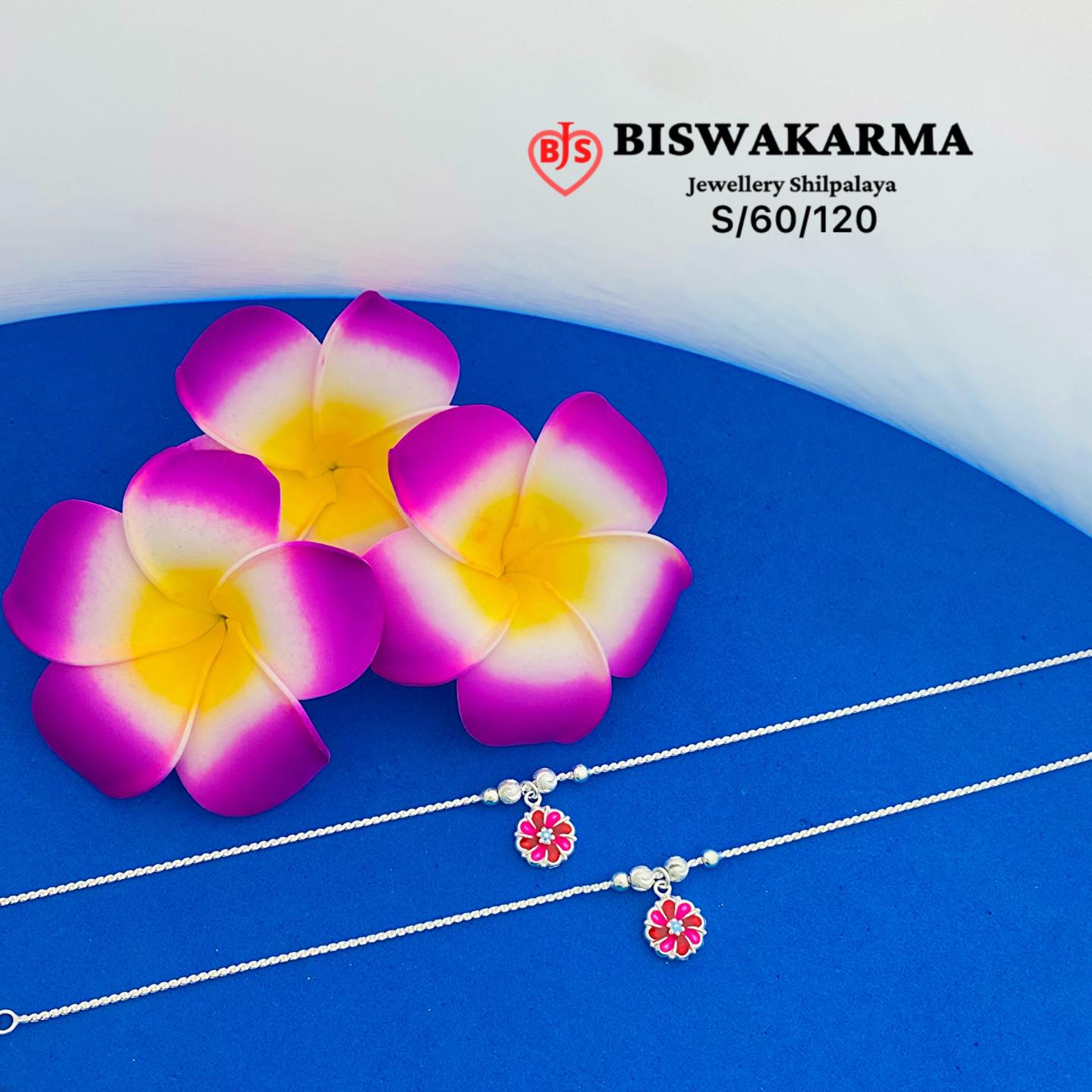 Fine silver chain with a hand-cut pink stone flower. Small dome-set petals sit deep on a neat center. Light wire links keep the line soft and clean.