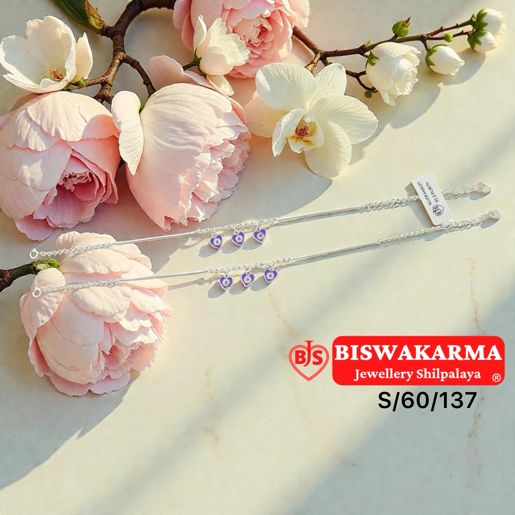 Silver chain with tiny heart drops spaced along the length. Hearts hand-filled in soft purple enamel with white dot centre. Fine links, light build, smooth finish.