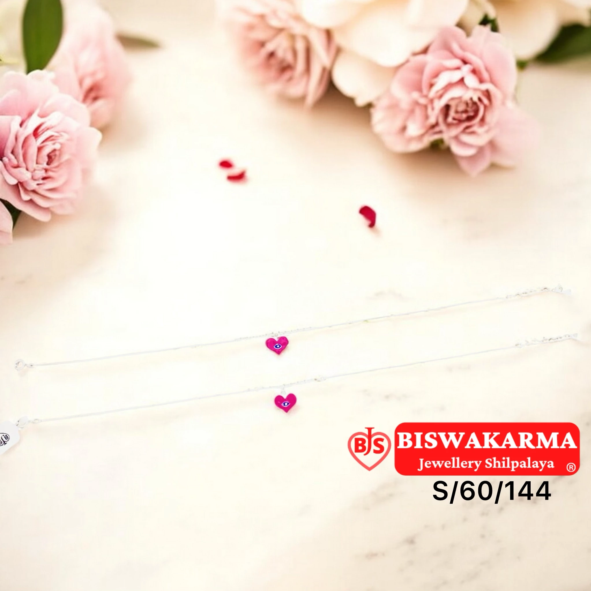 Silver chain with small heart drops set at the centre. Hearts hand-filled in bright pink enamel with tiny stone dot. Fine chain, light feel, smooth polish.
